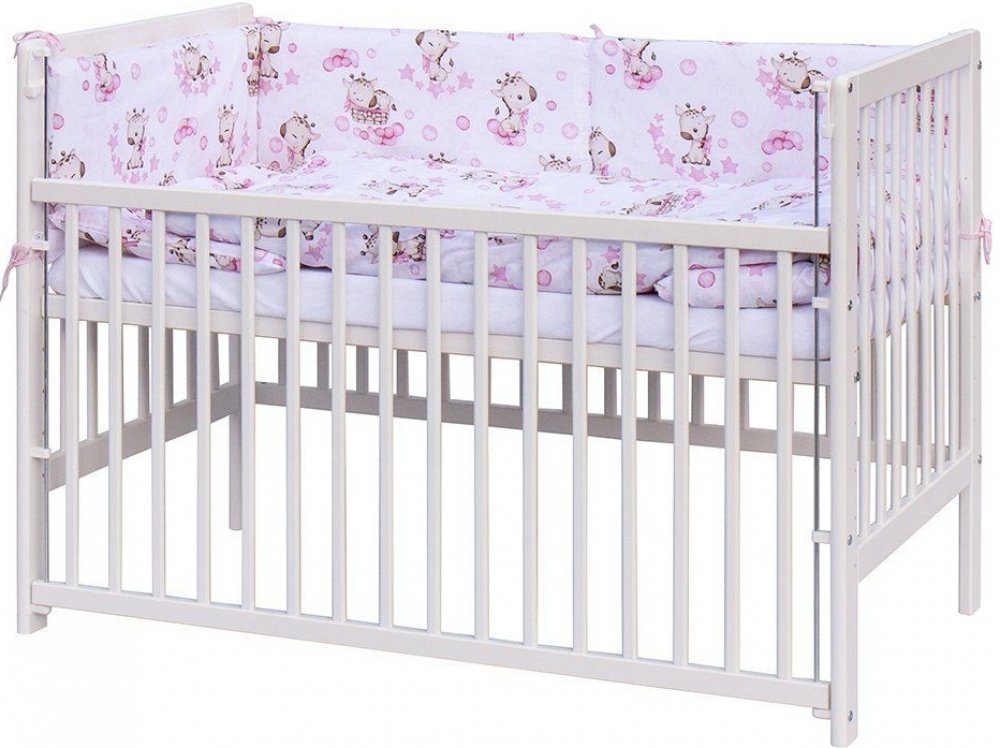 SCARLETT dětská postýlka bílá s kompletní výbavou 120x60 cm Fiki růžová Dětská postýlka s kompletní soupravou povlečení a doplňků Scarlett Fiki Vlastnosti: - dětská dřevěná postýlka 120 x 60 cm - přírodní, masiv borovice, stahovací bok, 6 poloh roštu - matrace 120 x 60 x 6 cm, PUR pěna, potah - 100% bavlna - potah na peřinku 135 x 100 cm - 100% bavlna - potah na polštářek 60 x 40 cm - 100% bavlna - výplň peřinky 135 x 100 cm - polyester, potah mikrofibra - výplň polštářku 60 x 40 cm - polyester, potah mikrofibra - mantinel do postýlky 180 x 30 cm - potah 100% bavlna, výplň polyester - prostěradlo froté 120 x 60 cm - bavlna