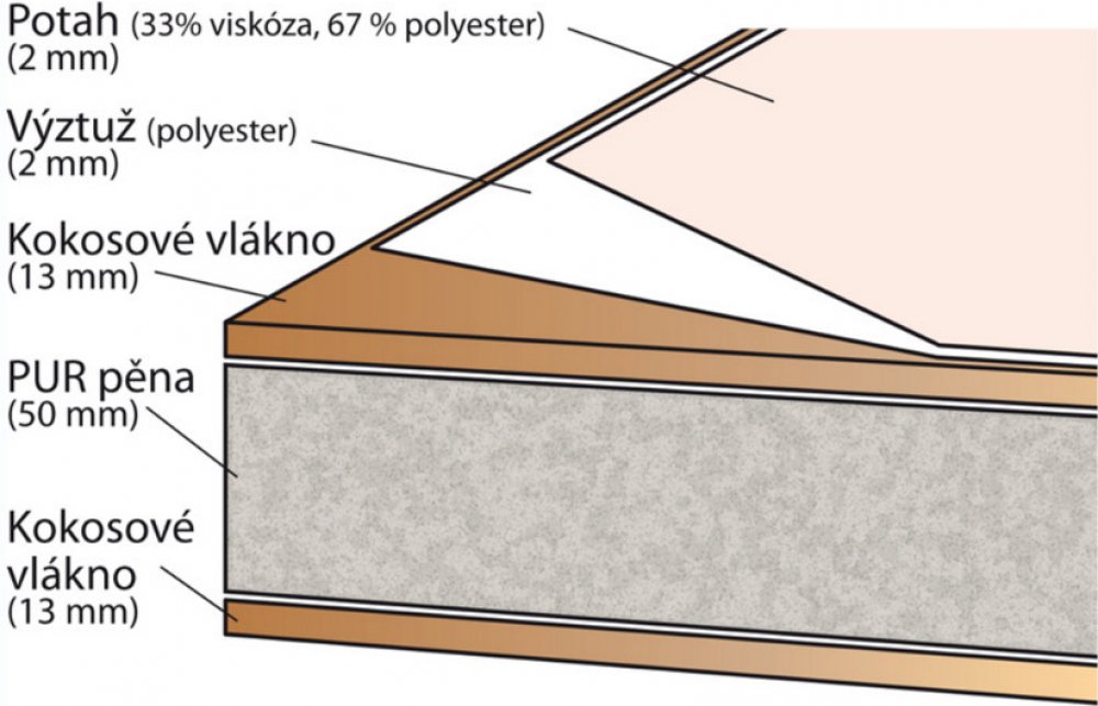Kokosové vlákno + PUR pěna + kokosové vlákno Potah