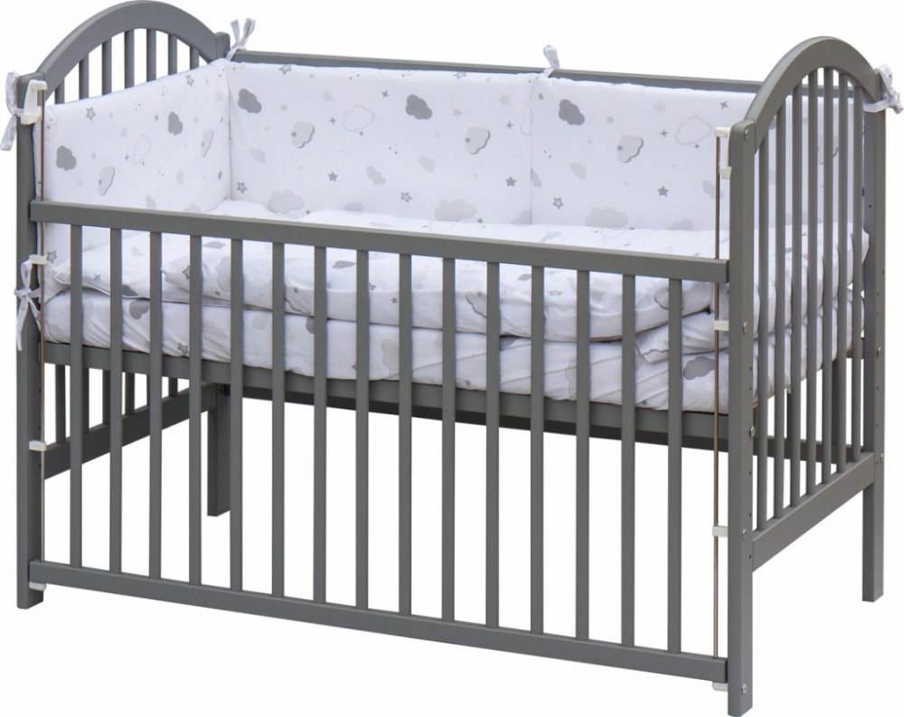 Komplet obsahuje1. Dětská dřevěná postýlka 120 x 60 cm - šedá, masiv borovice, stahovací bok, 6 poloh roštu, nohy postýlky jsou předvrtané pro případné nasazení koleček2. Matrace 120 x 60 x 6 cm, PUR pěna, potah - 100% bavlna3. Potah na peřinku 120 x 90 cm - 100% bavlna4. Potah na polštářek 60 x 40 cm - 100% bavlna5. Výplň peřinky 120 x 90 cm - polyester, potah mikrofibra6. Výplň polštářku 60 x 40 cm - polyester, potah mikrofibra7. Mantinel do postýlky 180 x 30 cm - potah 100% bavlna, výplň polyester8. Prostěradlo 120 x 60 cm - bavlna
