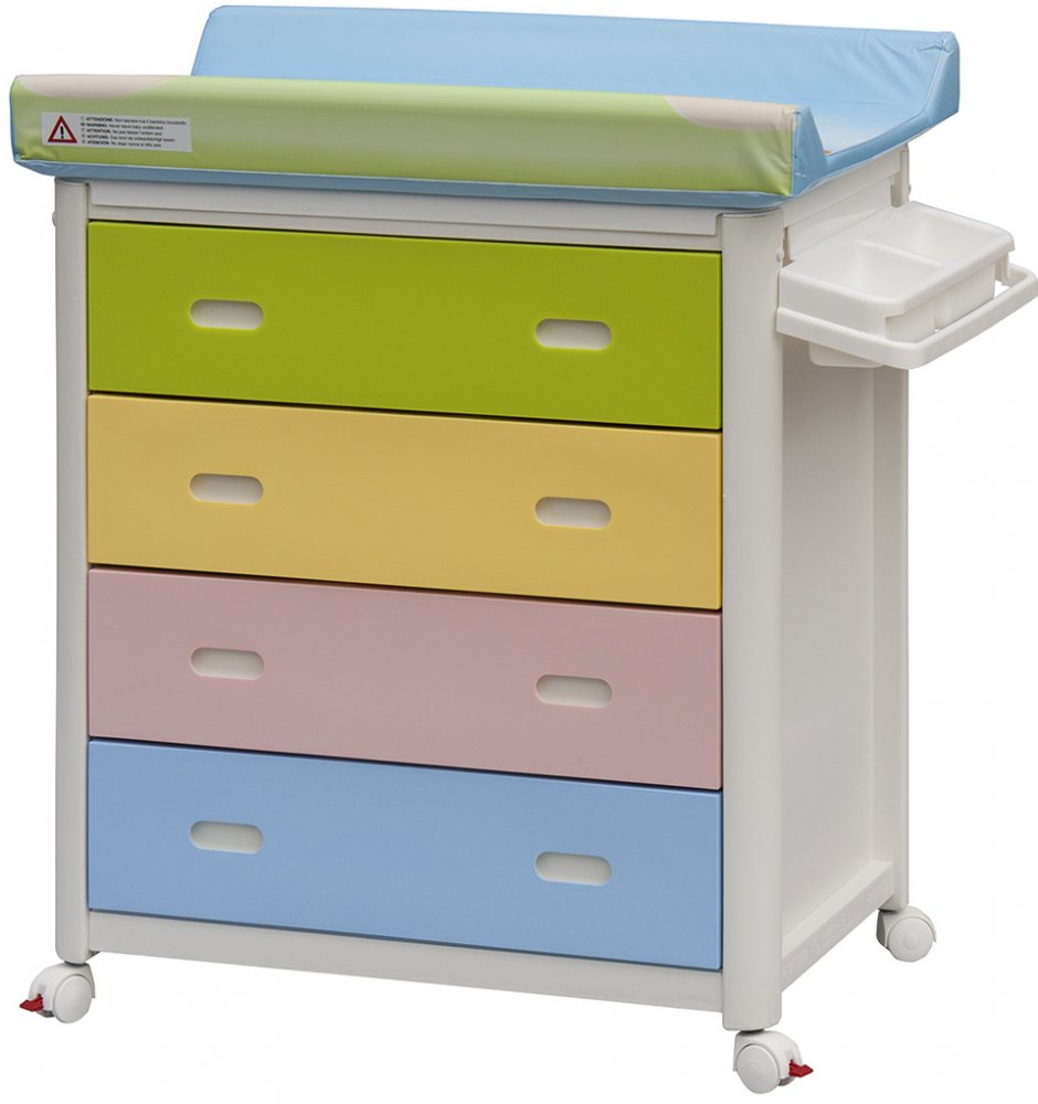 Materiál celé komody je zdravotně nezávadný plast. Komoda je vybavena kolečky s brzdou. Komodu lze tedy velmi jednoduše přesouvat dle potřeby. Po odklopení tvarovaného přebalovacího pultu se zpřístupní vanička.