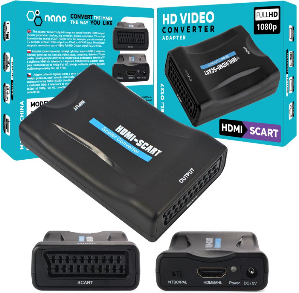 Adaptér pro převod video a audio signálu z HDMI na AV / Euro / SCART. Převádí video signál a digitální zvuk z výstupu HDMI (z novějších zařízení, jako jsou konzole, přehrávače, počítače, televizory a set-top boxy) do analogového formátu CVBS. Umožňuje například připojit televizní dekodér s výstupem HDMI k televizoru se vstupem Euro / SCART. Převodník má pouze kompositní video (CVBS).