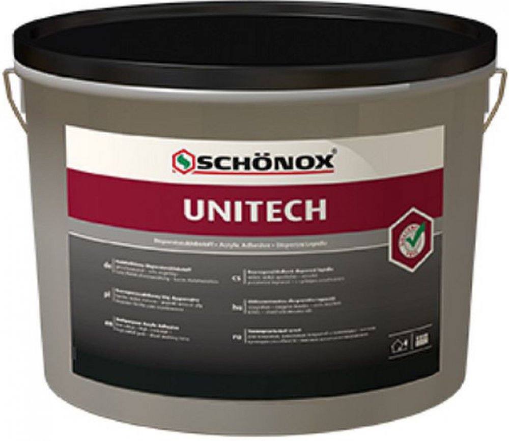 Disperzní lepidlo Schönox UNITECH je určeno pro lepení PVC, CV a textilních krytin na všechny savé podklady ve vnitřním prostředí. Jeho receptura je vyvinuta tak, aby svými vlastnostmi vyhovovala požadavkům efektivně a profesionálně pracujících řemeslníků. Lepidlo UNITECH je pomocníkem při lepení velkých ploch, kdy nabízí velmi krátkou dobu odvětrání cca 5 – 10 minut (dle nasákavosti podkladu) a zároveň díky své otevřené době zpracování cca 30 minut obstojí i při náročnějším lepení členitých míst.