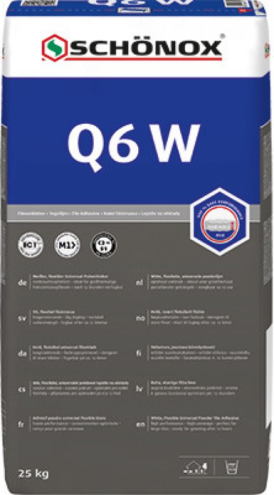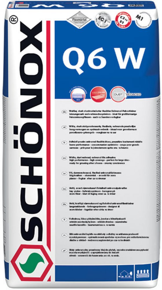 * Hydraulicky tuhnoucí, vysoce flexibilní práškové lepidlo s lehčenými plnivy a redukovanou prašností. * Optimální spotřeba i zpracování. * SCHÖNOX Q6 uvolňuje na základě nejmodernějších surovin a inovativních výrobních technologií během míchání s vodou až o 90% méně prachových částic. * SCHÖNOX Q6 je univerzální lepidlo pro lepení do tenkého, středního i silného lože na stěnách a podlahách. * Lze použít i jako lepidlo pro tekuté lože na podlahách. * Klasifikace: C2 TE S1 zlepšené, flexibilní cementové lepidlo se sníženým skluzem a prodlouženou dobou zavadnutí