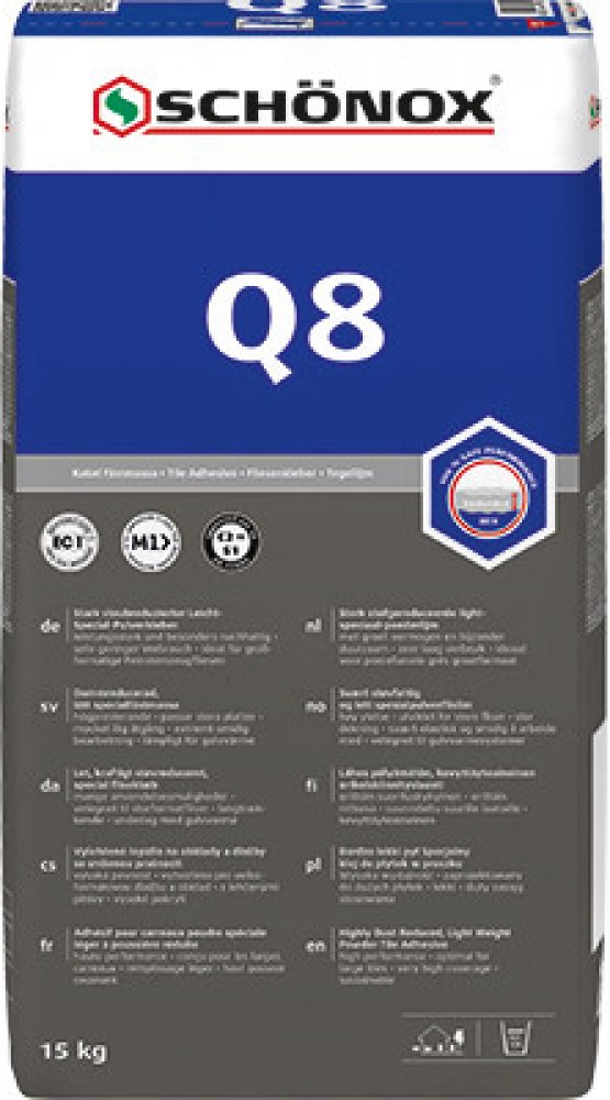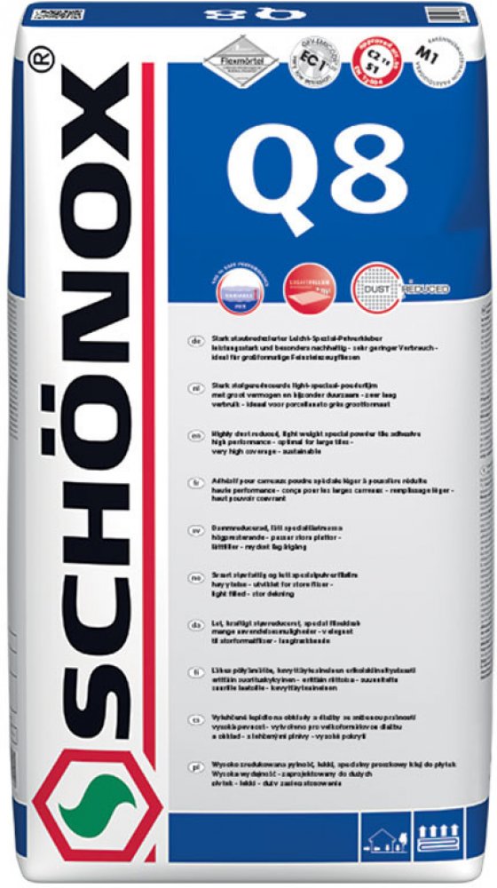 * Hydraulicky tuhnoucí, vysoce flexibilní práškové lepidlo s lehčenými plnivy a redukovanou prašností. * Optimální spotřeba i zpracování. * SCHÖNOX Q8 je univerzální pro lepení do tenkého, středního i silného lože na stěnách a podlahách. * Lze použít i jako lepidlo pro tekuté lože na podlahách. * Obsahuje cca 50% „trvale obnovitelných“ surovin. * Klasifikace: C2 TE S1 zlepšené, flexibilní cementov...