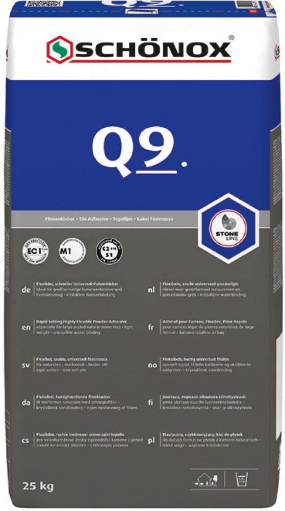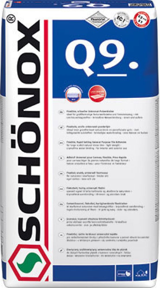 Schonox Q9 je rychle tvrdnoucí flexibilní cementové lepidlo se sníženým skluzem a prodlouženou dobou zavadnutí. Na podlahy ho lze nanášet ve formě tekuté malty.