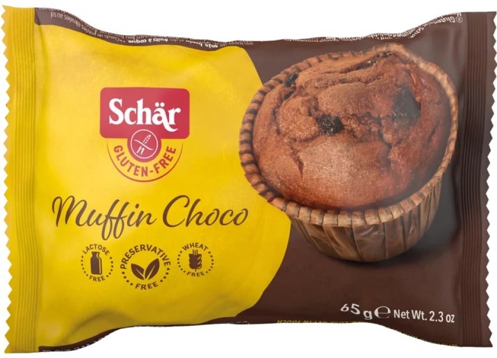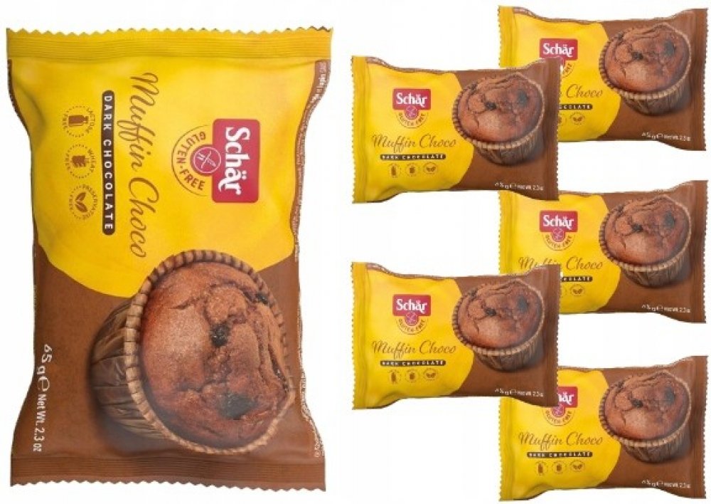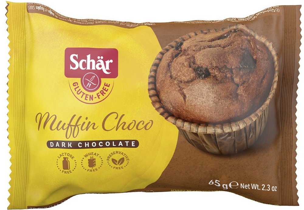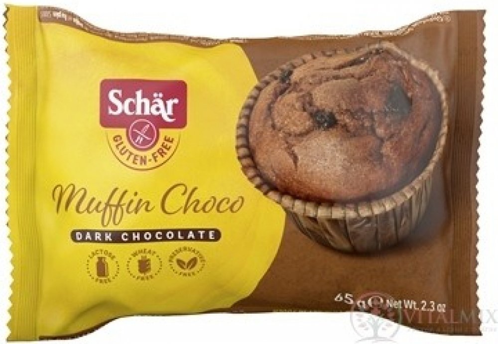 Schar Muffin Choco 65g bezlepkové muffins pro Vaše ranní potěšení u kávy. Jemné pečivo kakaové bez lepku Složení: vejce, slunečnicový olej, cukr, rýžová mouka, čokoláda 11% (kakao 40%, kakaová hmota, kakaové máslo, kakaový prášek, emulgátor: slunečnicový lecitin) kukuřičná mouka, kukuřičný škrob, ovocný extrakt (karobový prášek, jablko, jogurt 4% (mléko), kakaový prášek 3%, emulgátory: mono- a dig...