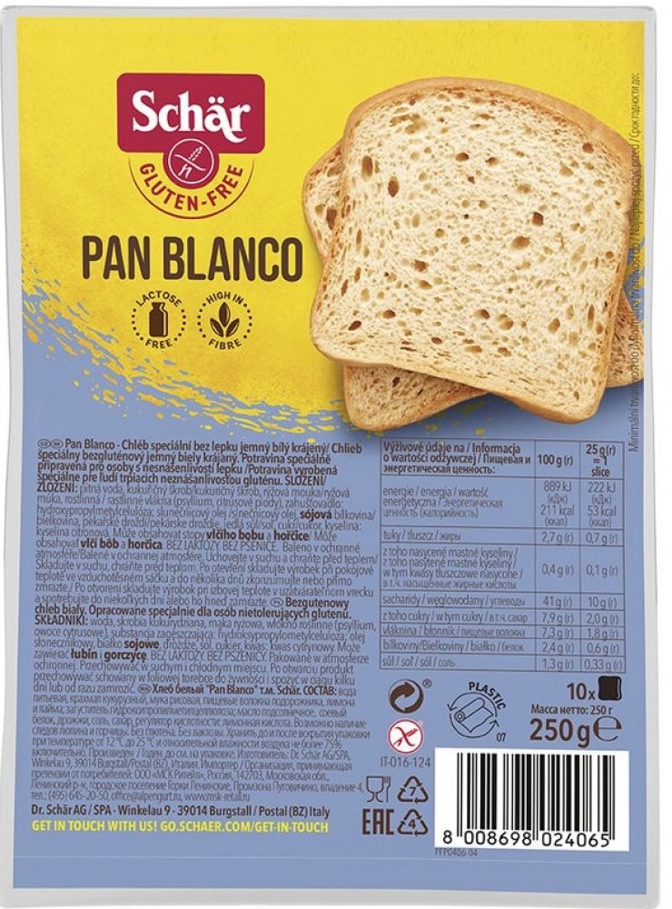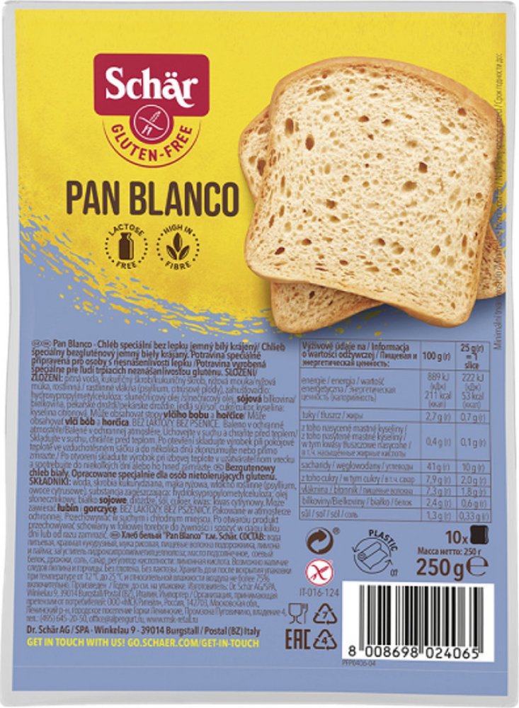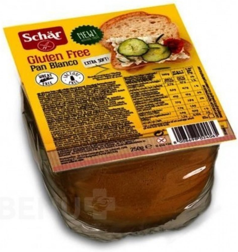 Schär Pan Blanco bezlepkový 250 g. Měkký světlý chléb bez lepku nakrájený na plátky. Vhodný k přímé konzumaci nebo k zapékání. Baleno v ochranné atmosféře. Speciálně připravená pro osoby s nesnášenlivostí lepku. Složení : Pitná voda, kukuřičný škrob, rýžová mouka, rostlinná vláknina (psyllium), zahušťovadlo: hydroxypropylmetylcelulóza, slunečnicový olej, sójová bílkovina, pekařské droždí, jedlá ...