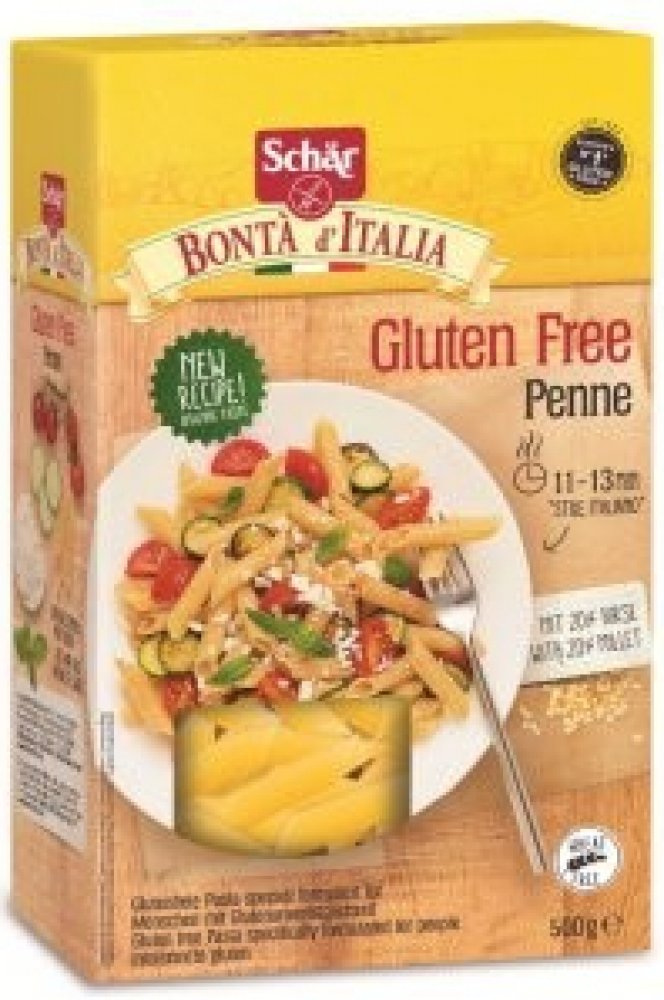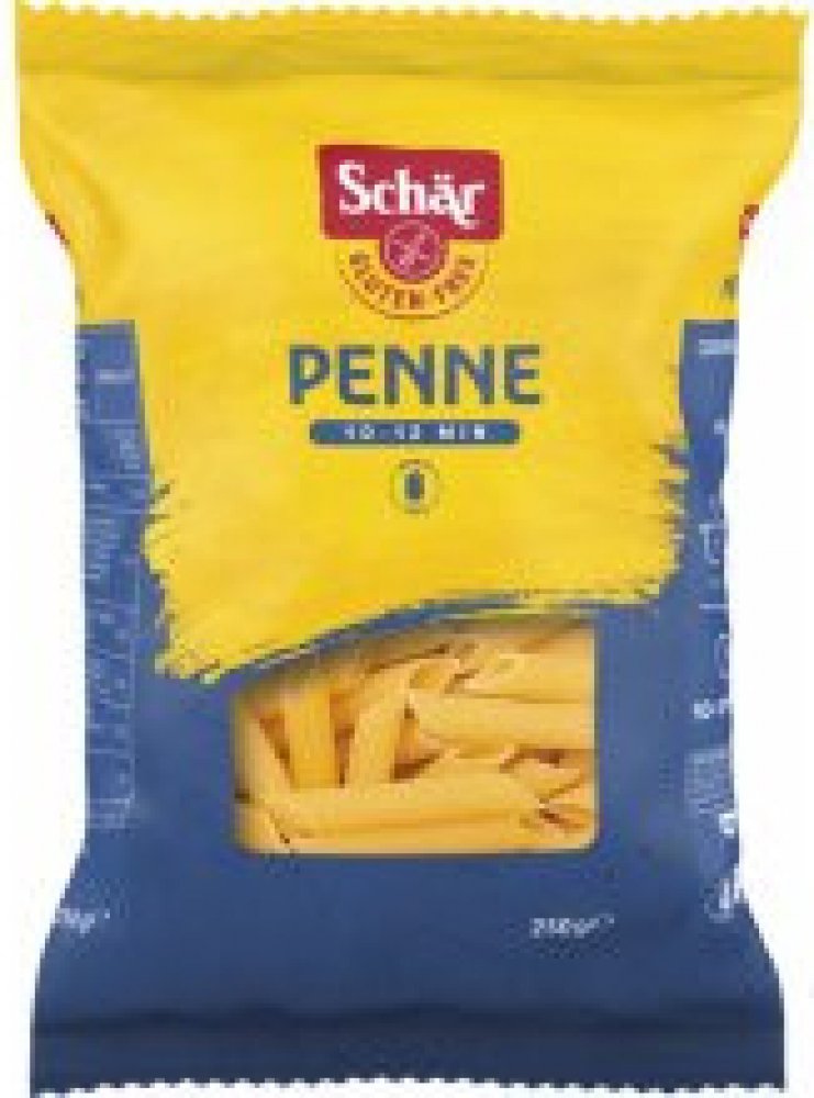 Těstoviny bezvaječné bezlepkové (Penne - ve tvaru trubky, šikmo střižené). Dietetická potravina vyrobená speciálně pro lidi trpící nesnášenlivostí lepku, vyrobená z bezlepkových a bezpšeničných surovin.