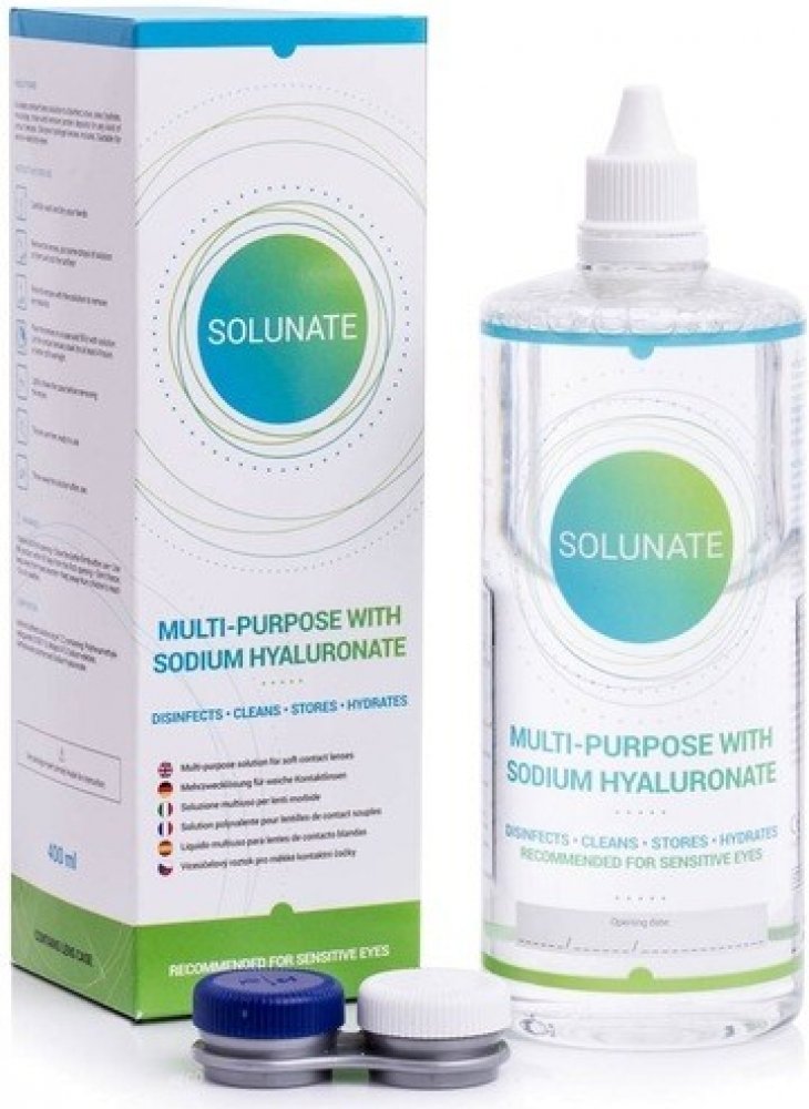 Solunate je nový víceúčelový roztok italské výroby, který uživatelům kromě vysoké kvality nabízí i ekonomicky výhodné balení za příznivou cenu. Větší balení 400 ml vám poskytne možnost používat roztok o 5 dní déle než roztoky v běžné velikosti (360 ml) a to za srovnatelnou cenu. Optimální poměr kvality a ceny řadí roztok Solunate mezi velmi oblíbené roztoky na trhu. Solunate je nejprodávanějším roztokem v našem e-shopu a je skvělou alternativou těch nejlepších roztoků na trhu jako jsou ReNu MPS Sensitive Eyes, Biotrue Multi-Purpose nebo řada OPTI-FREE. Univerzální roztok Solunate s obsahem kyseliny hyaluronové je určený k čištění, dezinfekci, zvlhčování, oplachování a uchovávání všech měkkých kontaktních čoček včetně silikon-hydrogelových. Roztok odstraňuje bílkovinové usazeniny a je vhodný pro citlivé a suché oči. Složení roztoku Solunate je optimálně vyvážené – zaručuje dostatečnou účinnost a zároveň minimalizuje podráždění oka. Díky složení s obsahem kyseliny hyaluronové má roztok Solunate schopnost dlouhodobé hydratace a zabraňuje tak nepříjemnému pocitu suchého oka. Kyselina hyaluronová má vynikající schopnost vázat vodu a v roztoku funguje jako vysoce efektivní lubrikant. Na oku vytváří ochranný film, který snižuje tření mezi očním víčkem a rohovkou, což je blahodárné pro podrážděné a suché oči. Kontaktní čočky tak vydrží dostatečně hydratované po celý den a jejich nošení je ještě pohodlnější a komfortnější. Součástí balení roztoku Solunate je také pouzdro na kontaktní čočky, které je inovativně umístěno přímo na lahvi roztoku a stává se tak její součástí. Díky tomu máte pouzdro při použití roztoku vždy k dispozici a nikdy se vám při cestách neztratí.