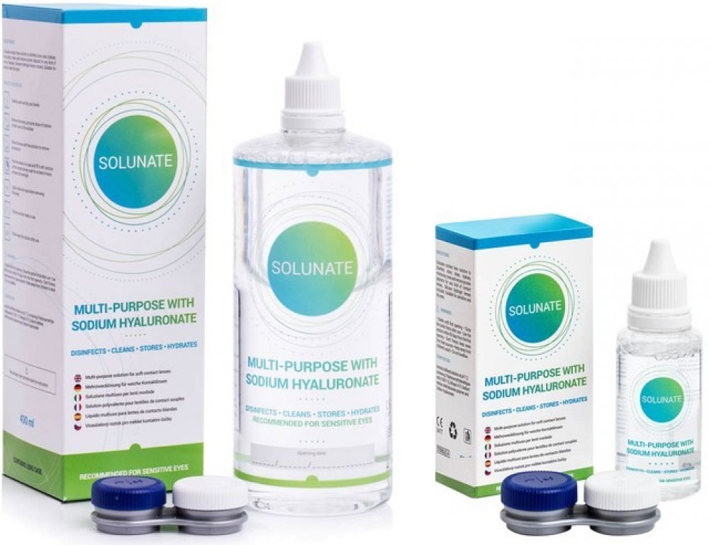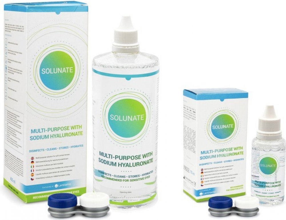 Solunate je nový víceúčelový roztok italské výroby, který uživatelům kromě vysoké kvality nabízí i ekonomicky výhodné balení za příznivou cenu. Větší balení 400 ml vám poskytne možnost používat roztok o 5 dní déle než roztoky v běžné velikosti (360 ml) a to za srovnatelnou cenu. Balení ve velikosti 50 ml je vhodné zejména do letadla, ale i na běžné cestování. Optimální poměr kvality a ceny řadí roztok Solunate mezi velmi oblíbené roztoky na trhu. Solunate je jedním z nejprodávanějších roztoků v našem e-shopu a je skvělou alternativou pro jiné univerzální roztoky jako jsou například ReNu MPS Sensitive Eyes, Biotrue Multi-Purpose nebo řada OPTI-FREE. Univerzální roztok Solunate s obsahem kyseliny hyaluronové je určený k čištění, dezinfekci, zvlhčování, oplachování a uchovávání všech měkkých kontaktních čoček včetně silikon-hydrogelových. Roztok odstraňuje bílkovinové usazeniny a je vhodný pro citlivé a suché oči. Složení roztoku Solunate je optimálně vyvážené – zaručuje dostatečnou účinnost a zároveň minimalizuje podráždění oka. Díky složení s obsahem kyseliny hyaluronové má roztok Solunate schopnost dlouhodobé hydratace a zabraňuje tak nepříjemnému pocitu suchého oka. Kyselina hyaluronová má vynikající schopnost vázat vodu a v roztoku funguje jako vysoce efektivní lubrikant. Na oku vytváří ochranný film, který snižuje tření mezi očním víčkem a rohovkou, což je blahodárné pro podrážděné a suché oči. Kontaktní čočky tak vydrží dostatečně hydratované po celý den a jejich nošení je ještě pohodlnější a komfortnější. Součástí balení roztoku Solunate je také pouzdro na kontaktní čočky, které je inovativně umístěno přímo na lahvi roztoku (400 ml) a stává se tak její součástí. Díky tomu máte pouzdro při použití roztoku vždy k dispozici a nikdy se vám při cestách neztratí.