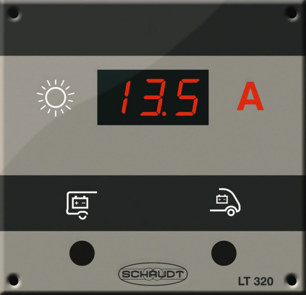 Kontrolní panel LT 320 Solar se připojí přímo k příslušnému solárnímu regulátoru SCHAUDT. Zobrazení solárního proudu v bytové a startovací baterii se provádí pomocí červeného LED displeje. Vhodné pro