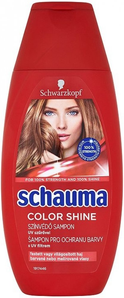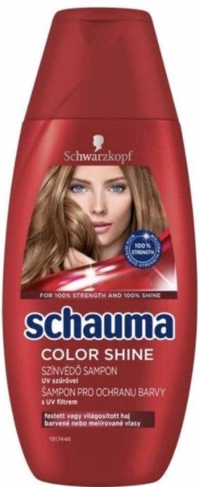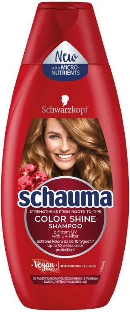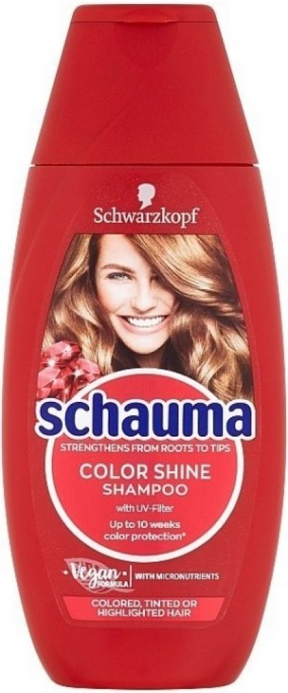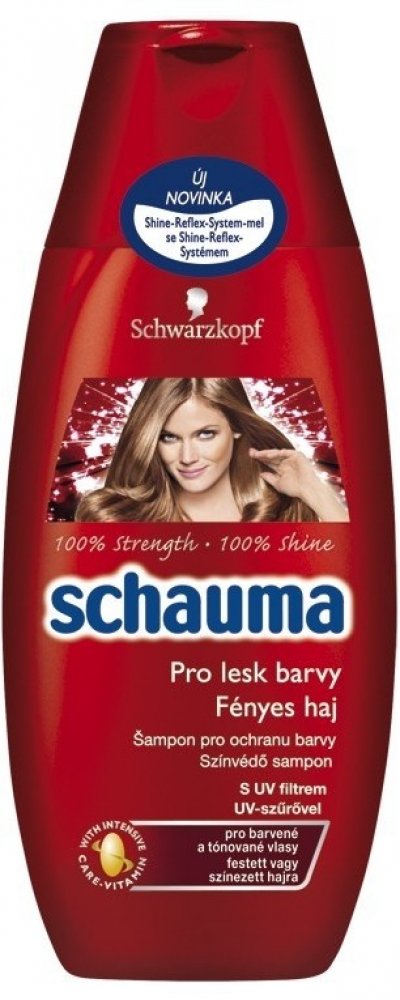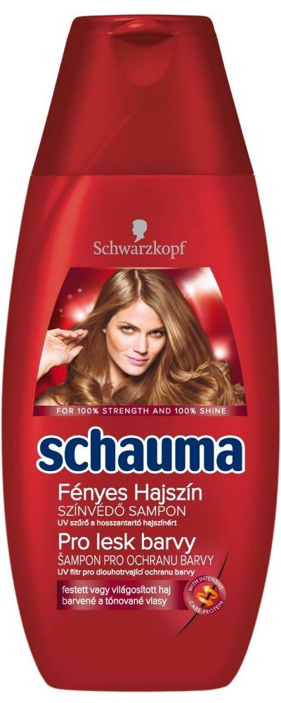 Receptura s UV filtrem poskytuje vlasům dlouhotrvající ochranu barvy a intenzivní lesk. Uhlazuje a regeneruje strukturu vlasů pro zářivý lesk barvy. Prokázaná účinnost: Schauma s intenzivně posilujícím proteinem dodává vlasům ztracené látky a posiluje oslabené části vlasů. Pro 100% sílu a 100% lesk.