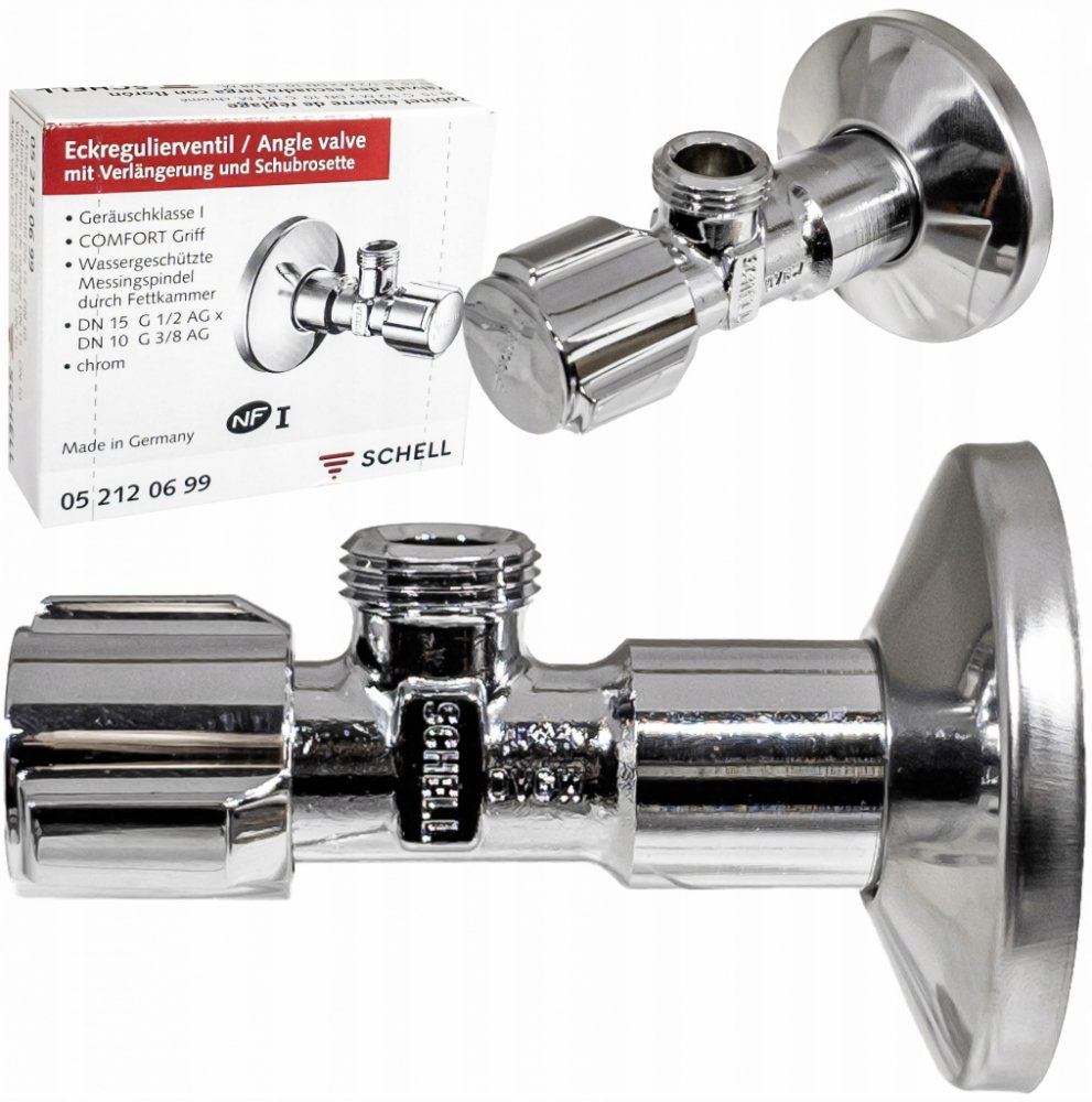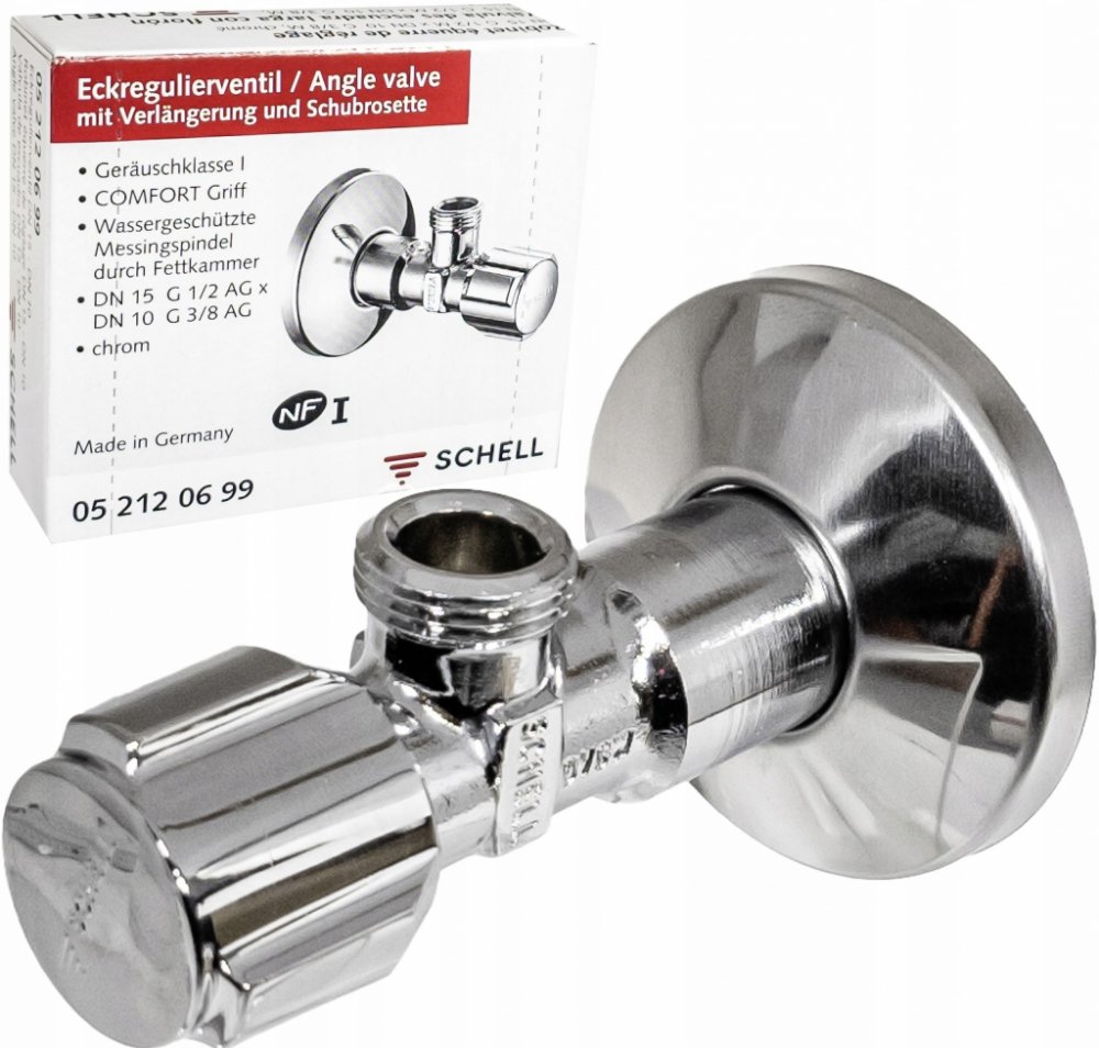 Vřetenový chromovaný roháček – kvalitní chromovaný rohový ventil Schell Comfort 052120699 s klasickým vřetýnkovým uzavíráním