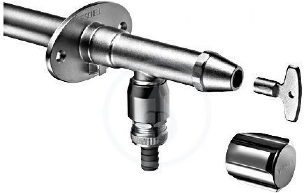 Ventil Schell Polar II je vyroben z mosazi a jeho povrch má barvu matný chrom. Jeho složení tvoří vršek na nástrčný klíč s rukojetí COMFORT, zpětná klapka, úchytka na stěnu s připevňovacím materiálem, měděná trubka a stěnová průchodka s izolovanou hadicí.
