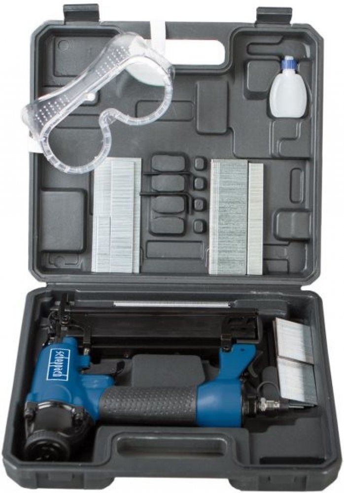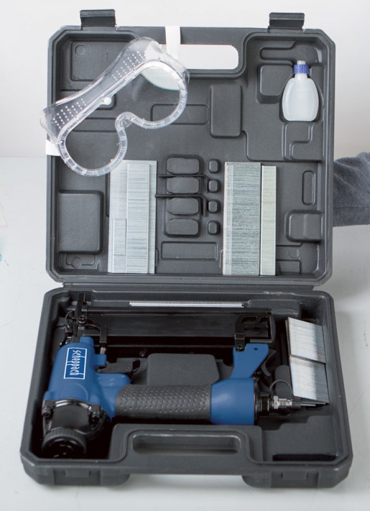 Sada sponkovačky/hřebíčkovačky a příslušenství v praktickém kufru skvělá pro spojování desek, lišt, izolačních materiálů, potahů, folií, palubek apod. určená pro hřebíky typu 18Ga (kolářské hřebíky) o velikosti 15 – 50 mm jednoduché nastavení hloubky, optická indikace nutnosti doplnění zásobníku