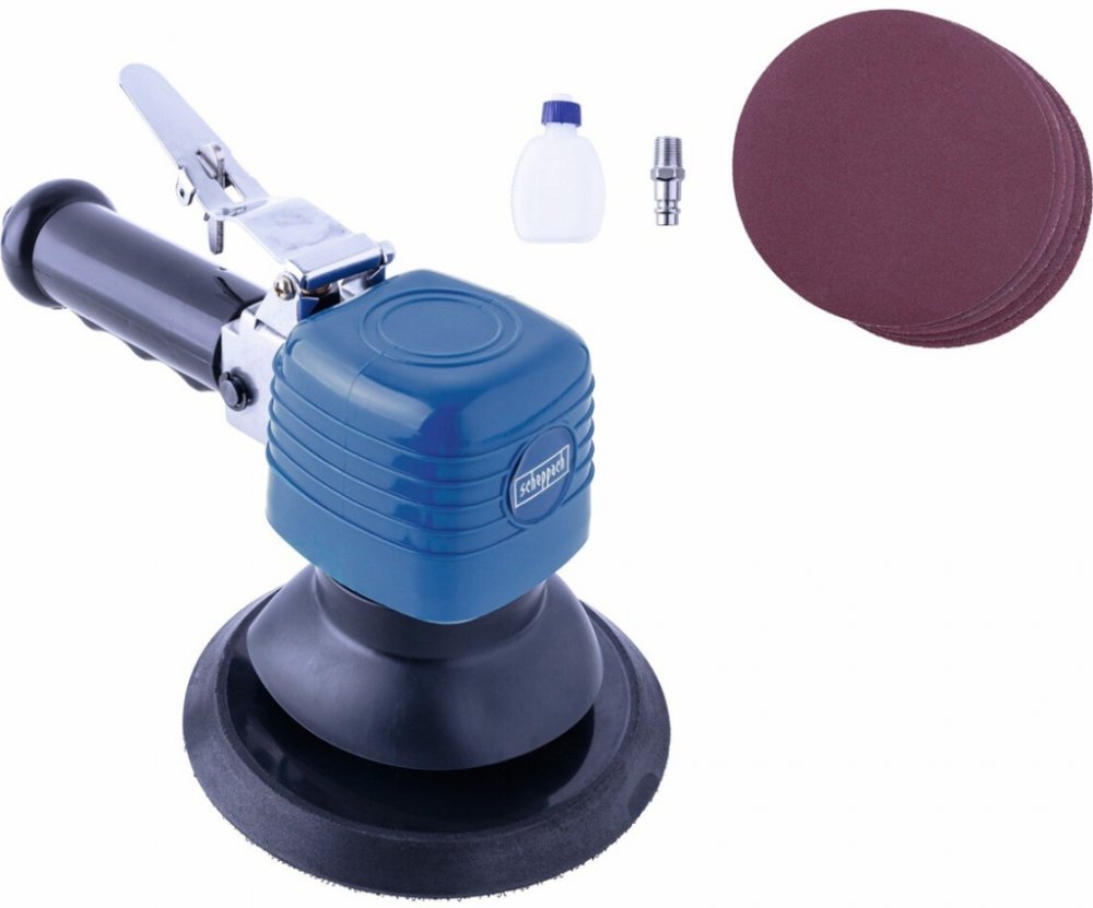 150 mm 10000 ot/min 1.8 kg Scheppach excentrické pneumatické na dřevo, plasty a kovy pro silné odstranění materiálu pro mobilní úlohy suchý zip 215 × 120 × 70 mm se středním komfortem