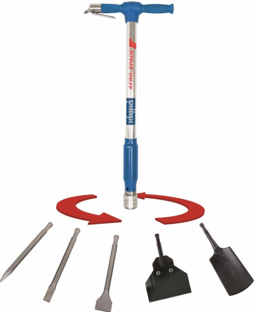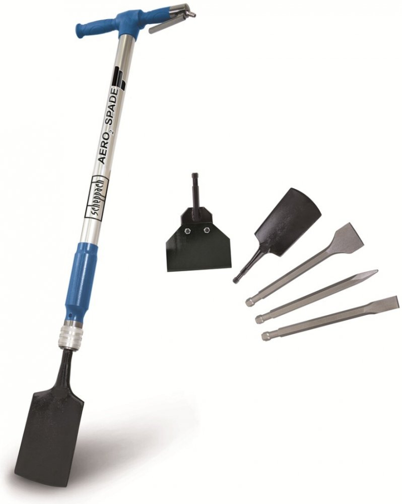 S multifunkčním pneumatickým nástrojem Aero2 Spade od Scheppachu se stane mnoho těžkých úkolů výrazně snazšími. Kopání a rytí ve ztvrdlé zemině, vykopávání starých stromků a keřů, odstraňování starých povrchů, odsekávání dlaždic, bourací práce apod. budou s tímto nástrojem daleko méně náročné. Aero 2 Spade je vhodný pro hobby i profesionální zahradníky, pro řemeslníky ze stavebních oborů a pro všechny, kdo např. rekonstruují rodinný domek. Kompaktní design je příjemný na ovládání a není s ním problém dosáhnout i do těžko přístupných míst. Rukojeti mají gumový povrch tlumící vibrace. Rychloupínací systém výměny nástrojů umožňuje jejich snadnou a rychlou výměnu. Rovněž připojení ke kompresoru rychlospojkou je dílem okamžiku. Pět standardně dodávaných nástrojů od sekáčů přes škrabku až po rýč je zárukou opravdu univerzálního využití.