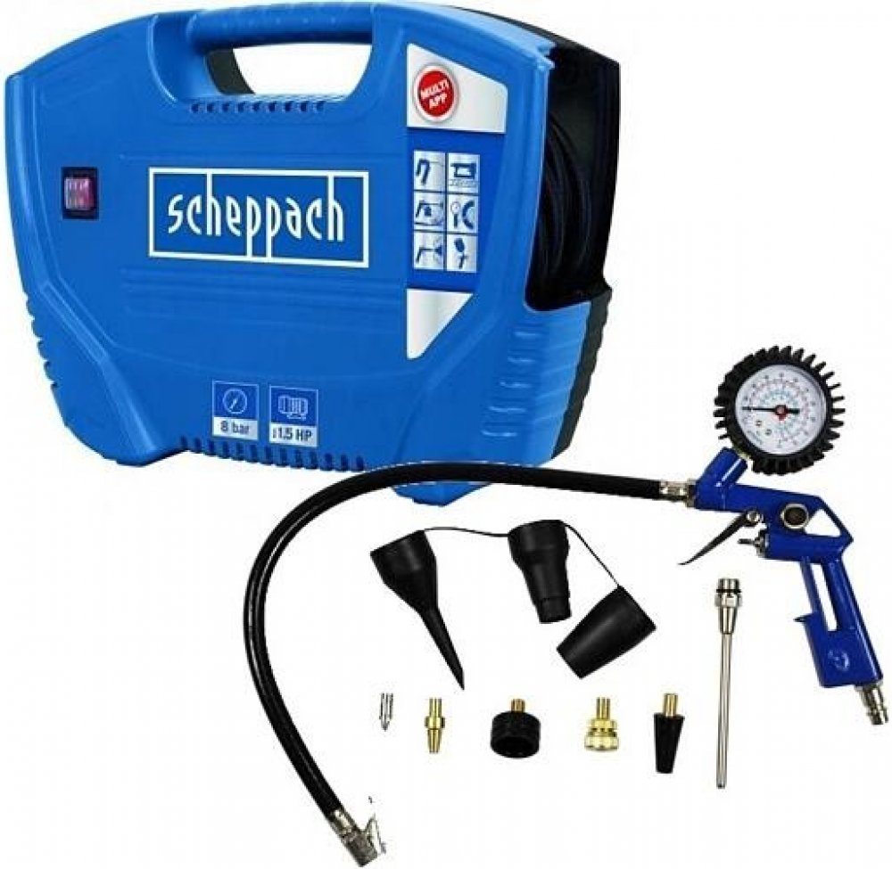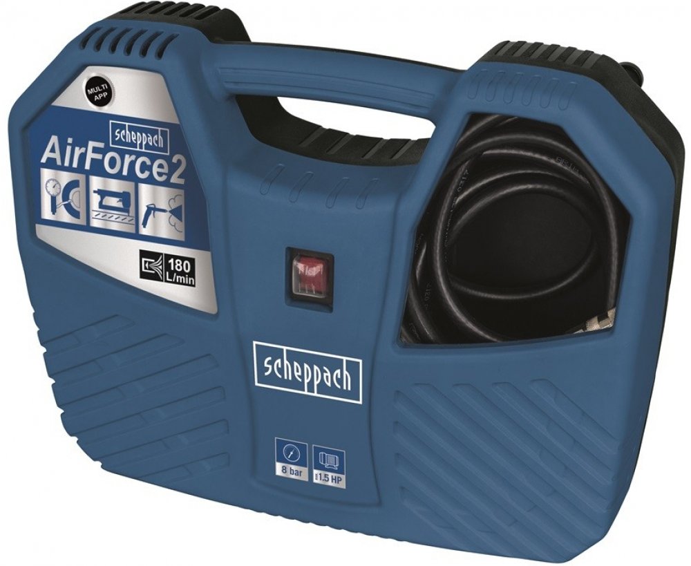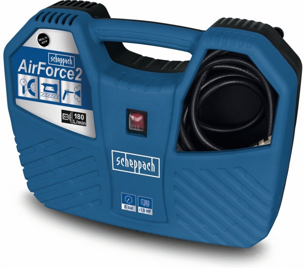 Kompresor Scheppach AIR FORCE 2 je praktický, skladný, lehký, výkonný a bohatě vybavený pomocník vhodný do každé domácnosti, chaty, karavanu nebo lodě. Díky velkému množství různých koncovek, silnému motoru a vysokému pracovnímu tlaku si hravě poradí s foukáním pneumatik motocyklů, kol, aut, terénních čtyřkolek, míčů, matrací, nafukovacích člun...