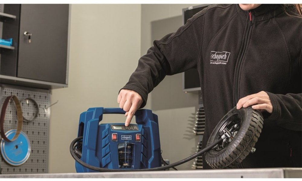 Kompresor Scheppach AIR FORCE 5 je malý, ale užitečný pomocník, kterého můžete napájet jak z běžné sítě na 230 V, tak i z běžné automobilové zásuvky na 12 V.