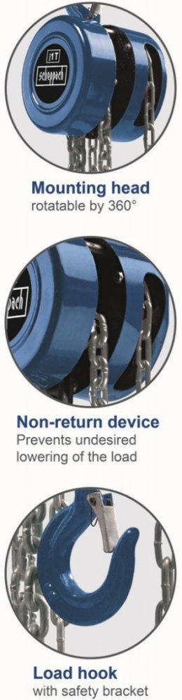 Tento ručně ovládaný kladkostroj je určený ke zvedání a spouštění břemen do hmotnosti jedné tuny. Výborně poslouží jako obslužné zdvihadlo pro montážní a údržbářské práce v dílnách nebo garážích. Výhodou je snadná údržba i obsluha a rovněž nezávislost na elektrickém proudu. Celá konstrukce obsahující veškeré důležité bezpečnostní prvky je poměrně lehká, snadno přemístitelná, má dlouhý obslužný řetěz a je vyrobena z velmi kvalitních materiálů. Velkou výhodou je i minimální vzdálenost mezi oběma háky pouhých 30 cm.