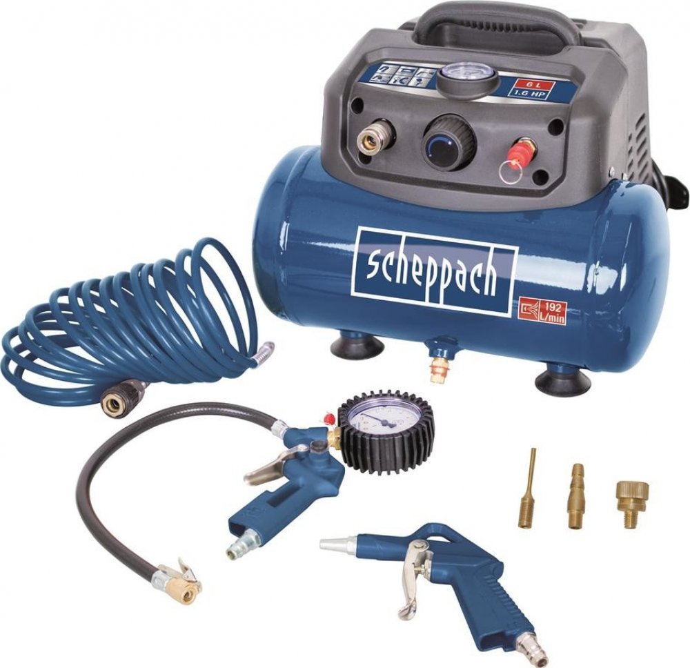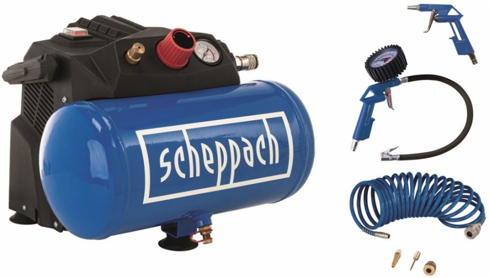 Kompresor Scheppach HC 06 je praktický, lehký a snadno přenosný kompresor s tlakovou nádobou o objemu 6 l a silným motorem 1200 W. Díky moderní bezolejové technologii má minimální nároky na údržbu. Hodí se jak do běžných domácích dílen, tak i pro řemeslníky, pro které je důležitým kritériem nízká váha, malá hmotnost a snadný transport. Díky vzdušníku se kompresor hodí nejenom na běžné nafukování pneumatik, míčů, matrací, jízdních kol, ale můžete k němu připojit i sponkovačku, stříkací pistoli (air brush), ofukovací pistoli apod. Díky bezolejové technologii je vhodný i na tlakování výčepních zařízení. Výši tlaku si jednoduše nastavíte otočným ovladačem a jednoduše kontrolujete pomocí vestavěného manometru. Stroj je vybaven velkým madlem, háky pro snadné namotání přípojného kabelu a pro dobrou stabilitu i nohami s gumovými patkami. Kompresor je už v základu vybaven bohatou sadou šestidílného příslušenství, takže ho můžete bez dalších finančních výdajů začít ihned používat. Nástroje šestidílné sady jsou vyrobeny z kvalitních slitin kovů a snadno se připojí na rychlospojku kompresoru.