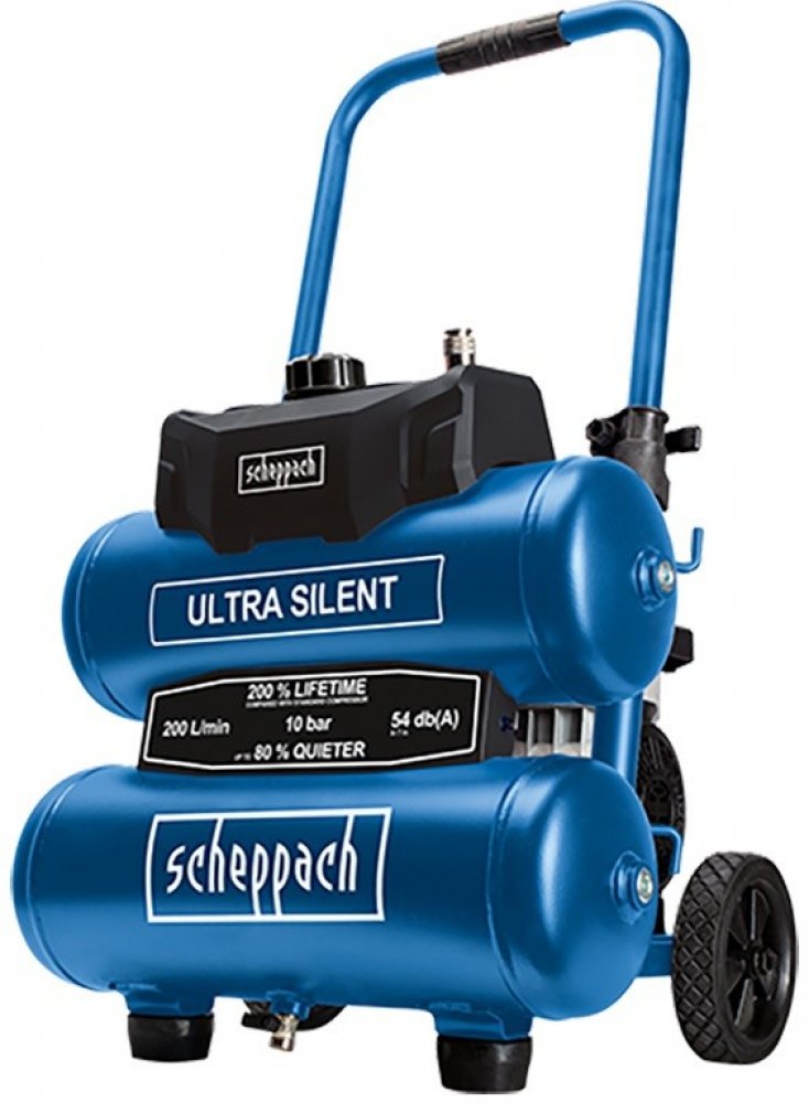 Kompresor Scheppach HC 20 Si Twin charakterizují nejlépe tři slova – tichý, výkonný a kompaktní. Je vhodný nejenom do každé dílny, ale díky svým parametrům i do míst a provozů s vysokými požadavky na nízkou míru hluku. Hlučnost 54 dB (A) znamená hladinu hluku zhruba na úrovni tlumeného rozhovoru, takže v praxi budete vnímat hluk tohoto kompresoru pouze minimálně. Další výhodou je bezolejová technologie, která znamená, že do vzdušníku ani dále do spotřebiče vzduchu, neunikají žádné olejové páry. To se hodí v potravinářství, u speciálních lakýrnických prací nebo třeba při tlakování výčepních zařízení. Bezolejová technologie znamená rovněž mnohem nižší nároky na údržbu celého stroje. Scheppach rovněž odstranil běžnou nevýhodu tichých kompresorů, a to poměrně nízký sací výkon. Díky nové technologii je sací výkon 200 l/min téměř dvakrát vyšší, než je běžné a je plně srovnatelný s klasickými kompresory. Navíc tato technologie zajišťuje až dvojnásobně dlouhou životnost stroje oproti běžným modelům. Vzdušník o objemu 20 l slouží jako zásobárna stlačeného vzduchu a motor se tak automaticky zapíná jen v případě, že tlak vzduchu klesne pod požadovanou úroveň. Kompaktní dvojitý vzdušník 20 l, spolu s vysokým tlakem až 10 barů, rovněž výrazně rozšiřuje možnosti kompresoru a stroj se tak stává opravdu multifunkčním pomocníkem. Díky němu můžete s kompresorem, mimo běžného huštění a ofukování, provádět i náročnější operace s použitím různých druhů pneumatického nářadí. Kompresor je vybaven dvěma manometry, teleskopickým madlem, držáky na kabel i tlakovou hadici, kolečky a antivibračním podstavcem. Díky své konstrukci je velmi kompaktní a je tak vhodný i na časté převážení a práci v terénu.Případné bezpečnostní pokyny, výstrahy a upozornění jsou součástí návodu k obsluze, který je k dispozici v sekci KE STAŽENÍ.