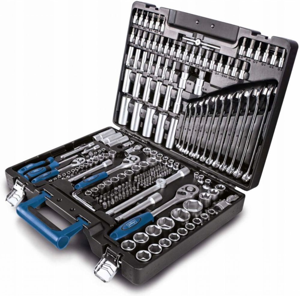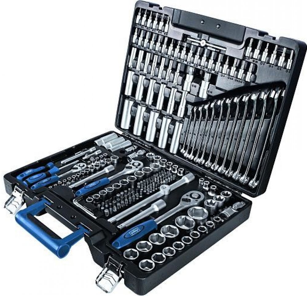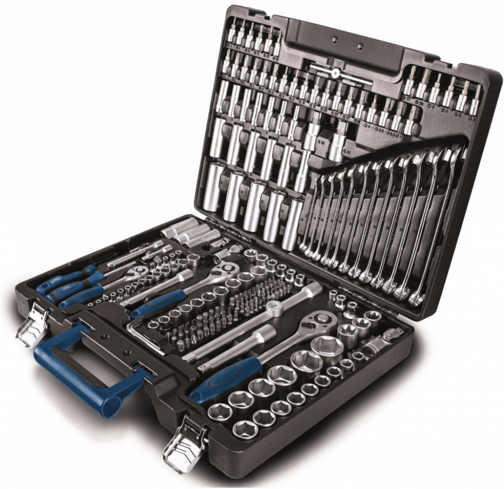 Scheppach TB 217 je velmi praktická a obsáhlá sada nářadí pro většinu prací spojených se šroubováním (217 ks) ukrytá v robustním plastovém kufru. Každý kus nářadí má přesně stanovené místo a bude tak vždy a rychle po ruce. Kufr se dá pomocí přezek pevně uzavřít a můžete ho snadno přenést na místo, kde budete nářadí potřebovat. Nářadí bylo vyvinuto tak, aby kvalitativně výrazně překračovalo běžné standardy v tomto cenovém segmentu. Kvalitní slitina Cr-V a CrMo (chrom-vanadium a chrom molybden)) a hroty bitů ze slitiny oceli S2, jakostní plast na rukojetích i pogumované protiskluzové zóny zaručí, že Vám bude nářadí sloužit po mnoho let. A znalci zase ocení jemný design a chod zubů ráčny, který umožňuje malý zpětný úhel pohybu o 5° a tvar, díky kterému můžete vyvinout větší sílu (ke kontaktu se šroubem dochází v první třetině šestihranu, ne na koncích) bez poničení šroubu.