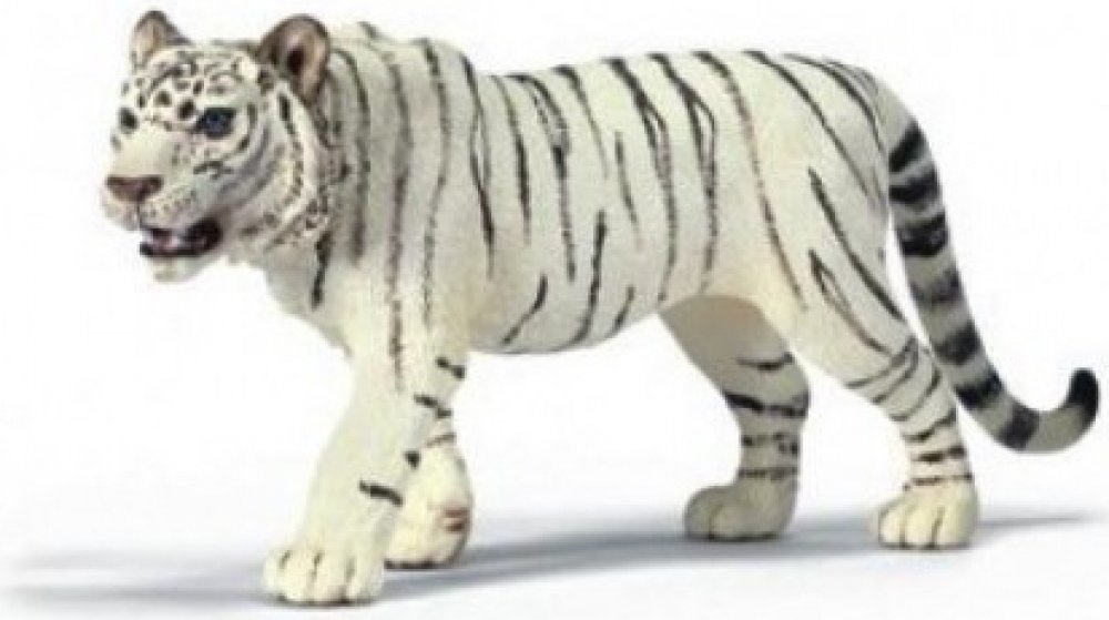 „Bílý tygr není druh, ale barevná odchylka, která se vyskytuje pouze u tygra indického. První byl odchycen v Indii v roce 1954, mláďata se narodila už pod dohledem lidí. Bílí tygři žijí a rozmnožují se pouze v zajetí, protože v přírodě by neměli možnost přežít.Bílý tygr zn. Schleich má modré oči, pečlivě provedenou kresbu pruhů a skvrn a okrově zbarvené polštářky tlap. Od hlavy k ocasu měří 13 cm a byl vzorován v roce 2007. Hračka pro děti od 3 let.