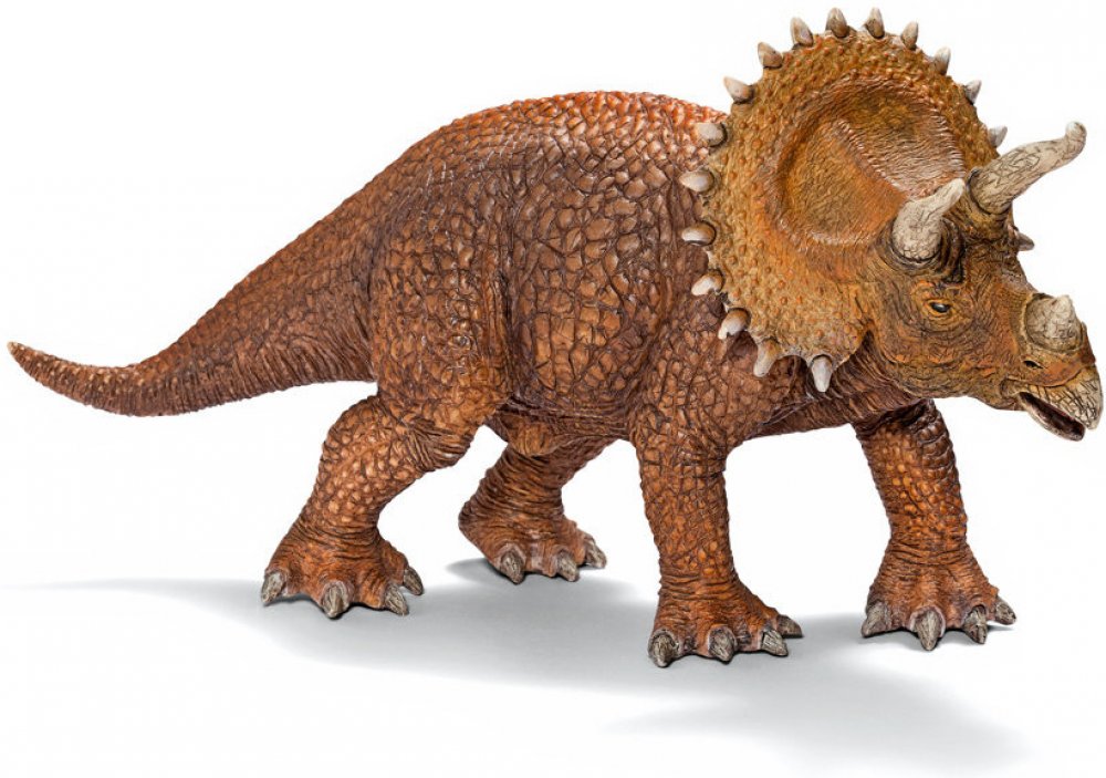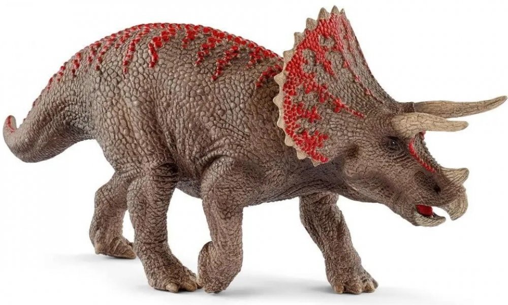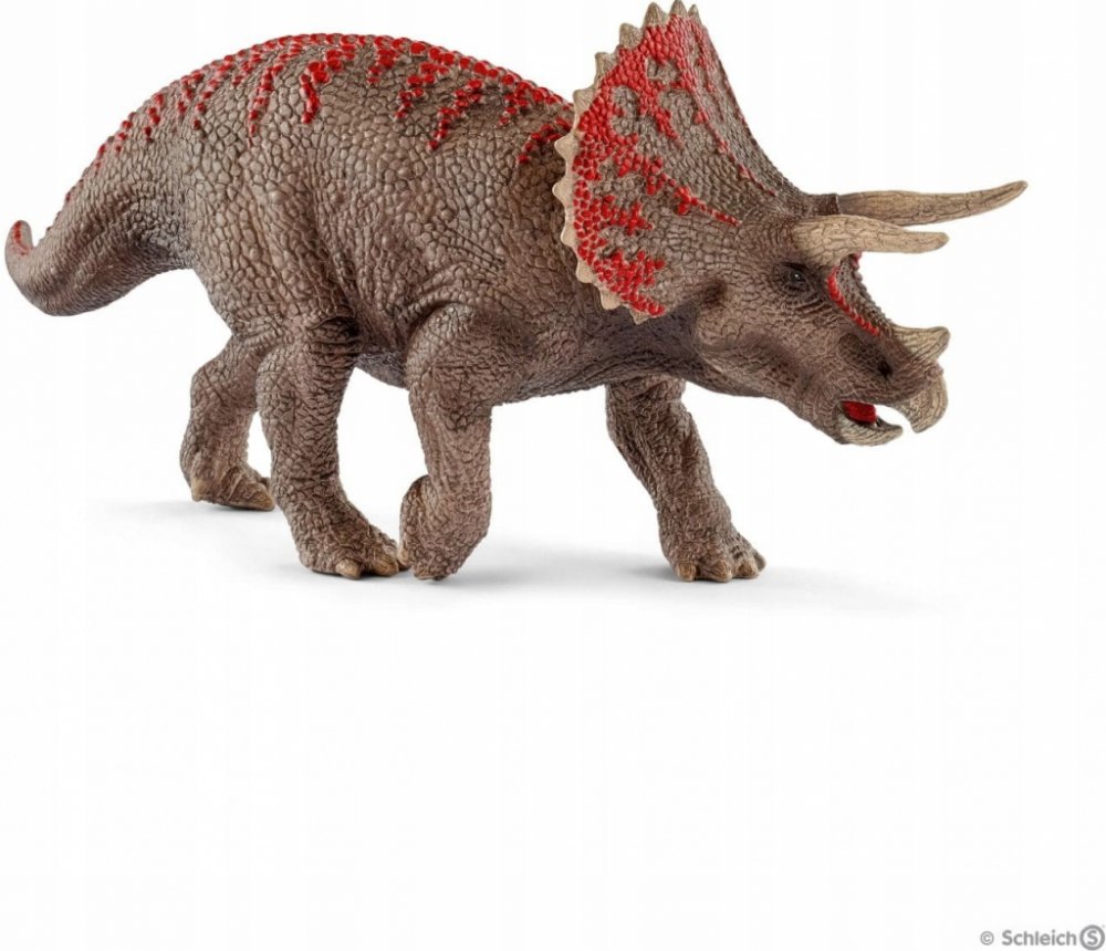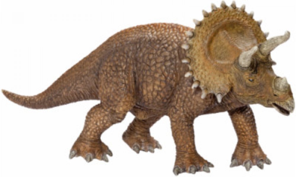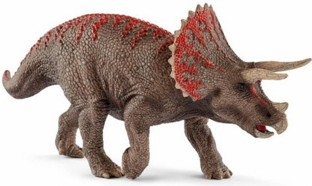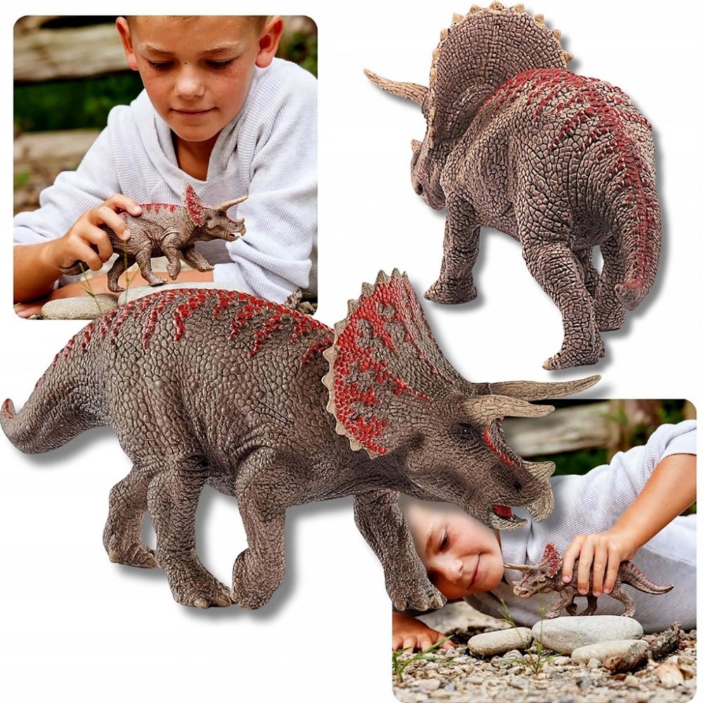 Jméno Triceratops znamená "tři rohy na hlavě". Ačkoliv Triceratops vypadal nebezpečně, krmil se výhradně rostlinami. Jako býložravec byl pronásledován Tyrannosaurusem Rexem. Přední část jeho čelisti byla formována jako zobák papouška, který se používá pro separaci rostlinné potravy. Triceratops měl tři rohy z keratinu, stejného proteinu, ze kterého jsou nehty a vlasy. Rohy nad jeho očima byly téměř metr dlouhé. Vzhledem k tomu, že jeho hlava vážila téměř jako malé auto a tvořila přibližně třetinu z jeho těla, měl také velmi těžký ocas, aby jeho deset metrů dlouhé tělo bylo v rovnováze. Nohy byly velmi silné, podobné nohám dnešních slonů. Figurka je vyrobena z kvalitního gumového materiálu, ručně malovaná.