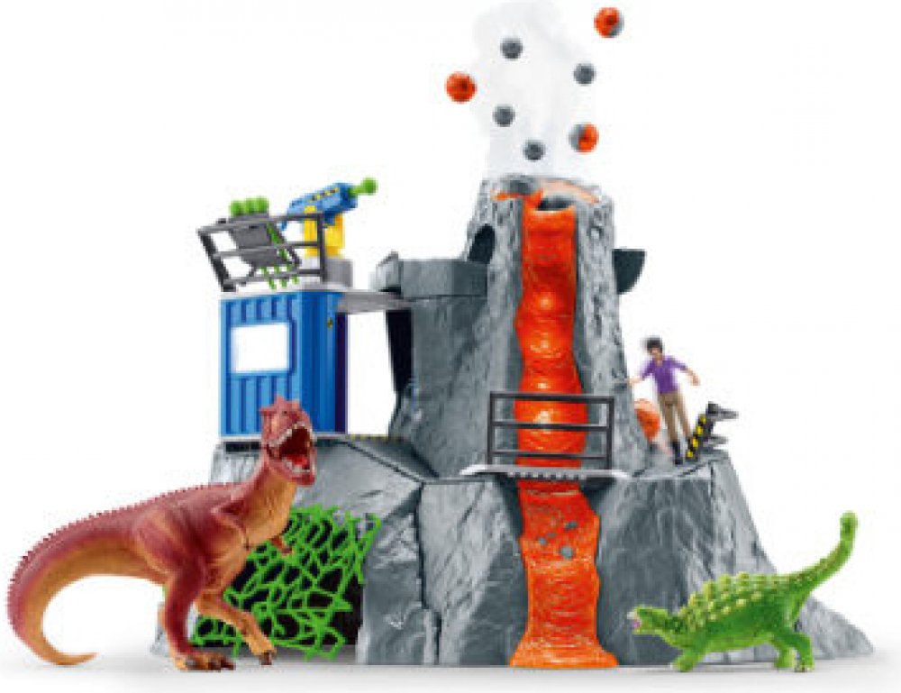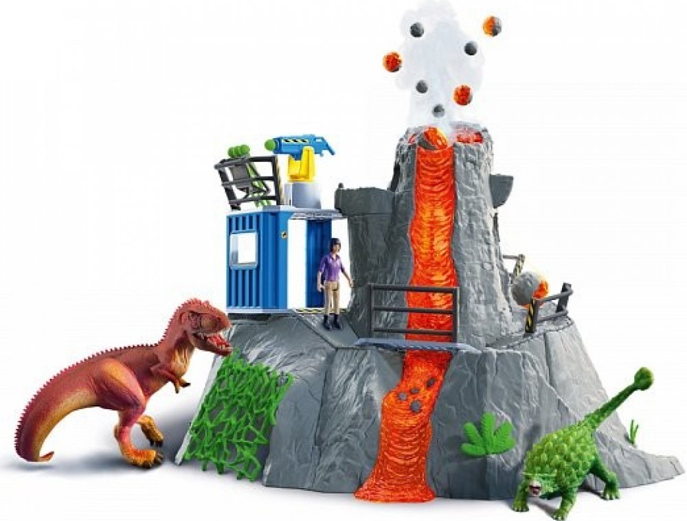 Výzkumnice Yuki z velké sopečné expedice ze Schleich® Dinosaurs sbírá do svého výzkumného kontejneru všechno, co se týká dinosaurů. Najednou slyší rachot: celá hora vibruje a stoupá dým. Reaguje bleskově a skáče na svou únikovou klouzačku, která ji doveze do tajné jeskyně pod sopkou. Stihla to jen taktak, protože sopka právě vybuchuje. Díky této funkci mohou být z kráteru sopky katapultovány kamen...