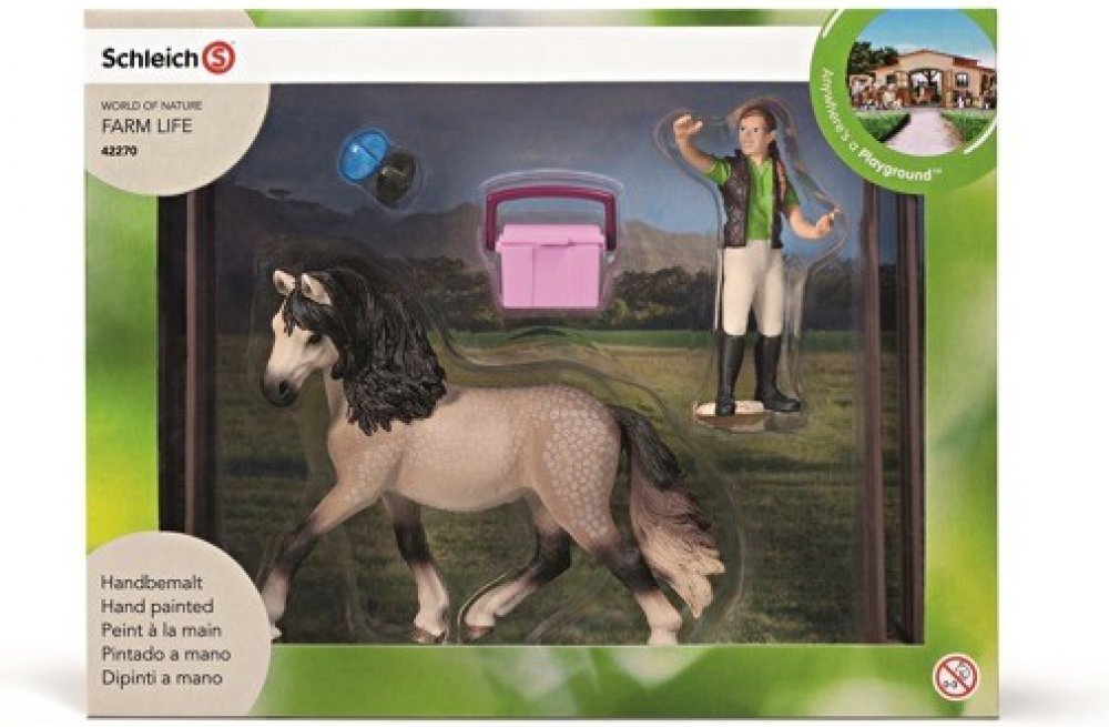 Každá malá milovnice koní zaručeně ocení sadu Péče o koně Andaluského. Po náročném dni, který byl plný tréninků a příprav na závody si váš koník jistě zaslouží odměnu v podobě pamlsků a pořádné vykartáčování. Dnešní trénink byl opradu úspěšný. Všechny skoky zvládá dobře. Po tréninku si zaslouží nějaké pamlsky a také upravit, očistit a vykartáčovat. Sada obsahuje: 1x kůň Andaluský 1x jezdkyně doplňky na péči o koně Figurky od firmy SCHLEICH jsou proslulé po celém světě. Díky těmto figurkám mohou děti poznávat všelijaké druhy zvířátek ze zvířecí říše. Vyznačují se svojí kvalitou a propracovaností. Jsou vyrobené ze zdravotně nezávadných materiálů. Rozměr balení: 24,3 x 19 x 8,2 cm Vhodné pro děti: 3+