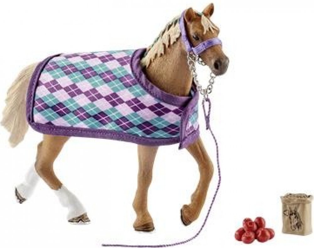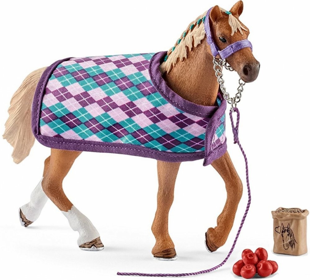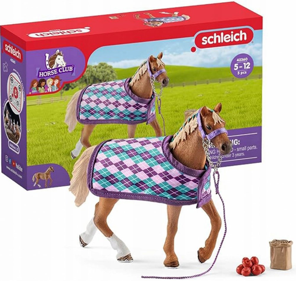 Ručně malovaná, detailně propracovaná sada anglického plnokrevníka s přikrývkou. Skvělý doplněk světa Schleich.