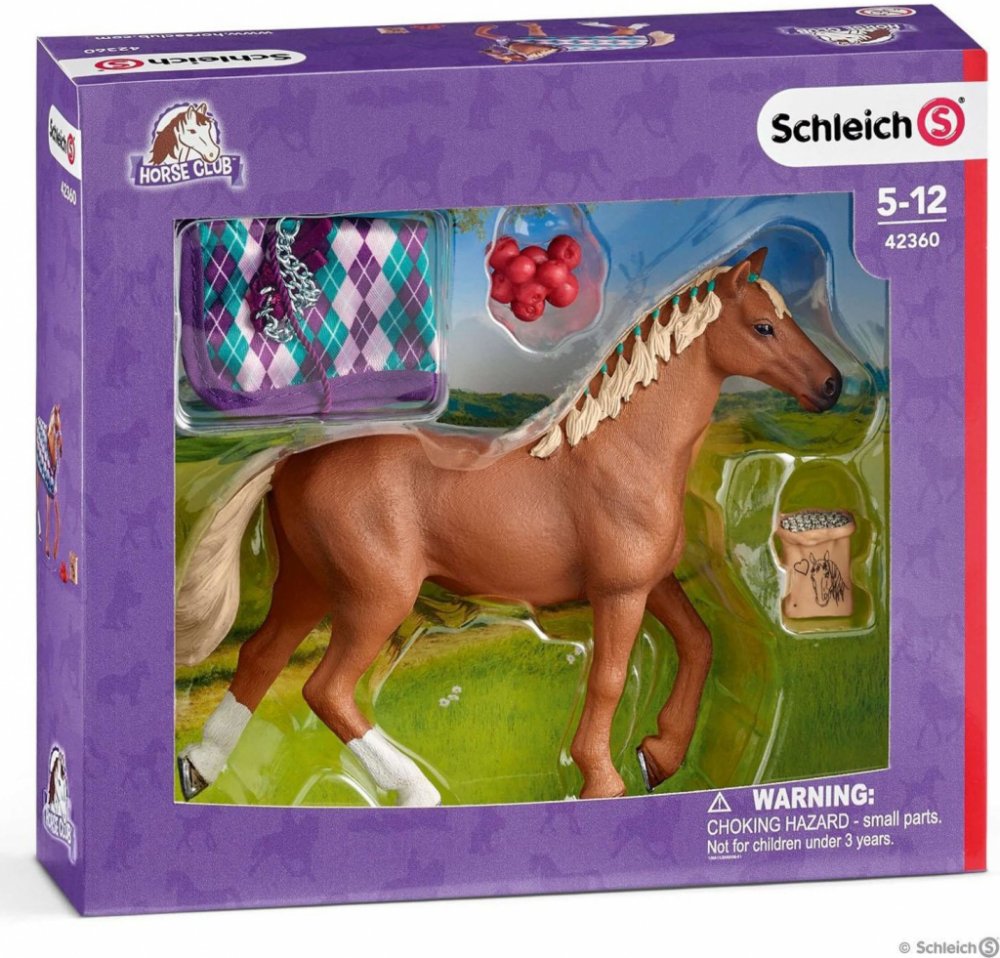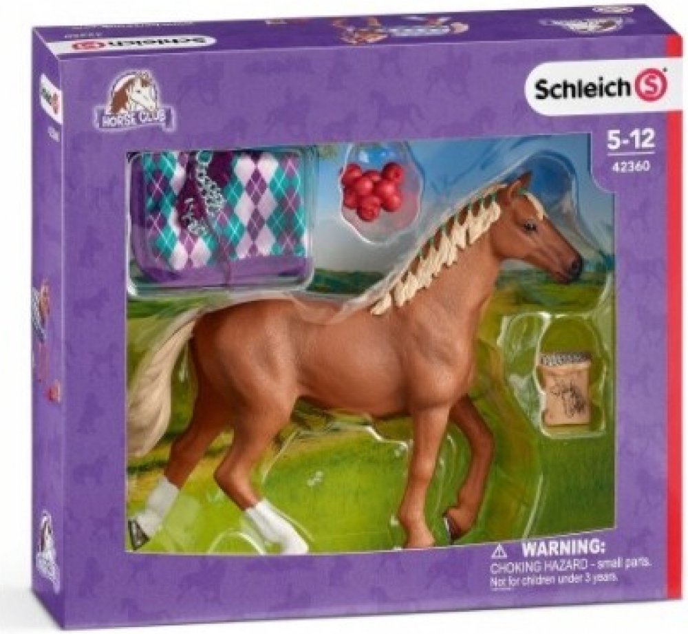 Balení obsahuje: koně, deku, uzdu, jablka, žrádlo pro koně.
