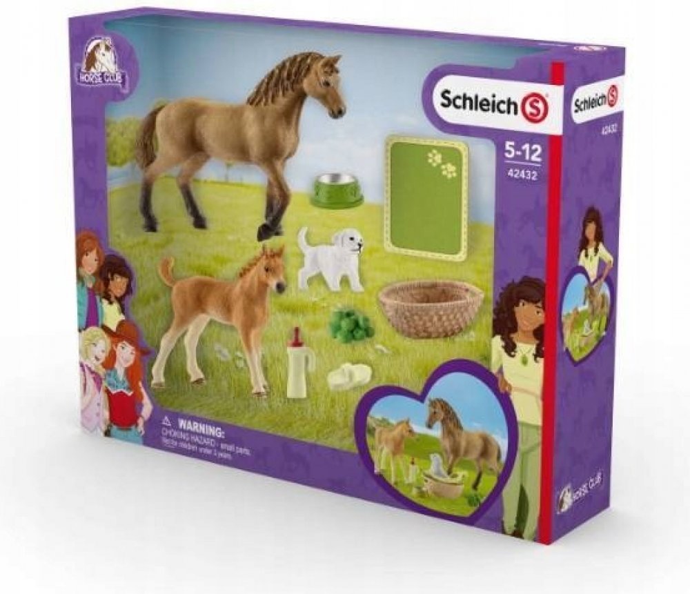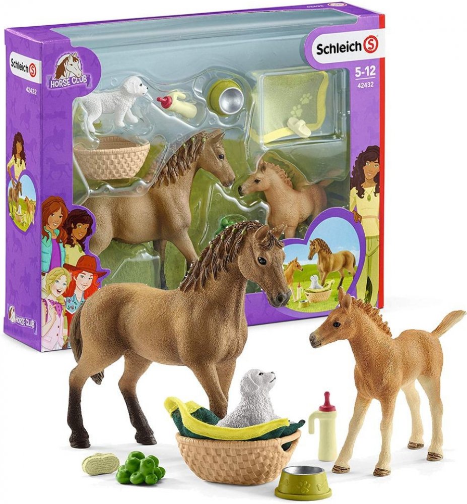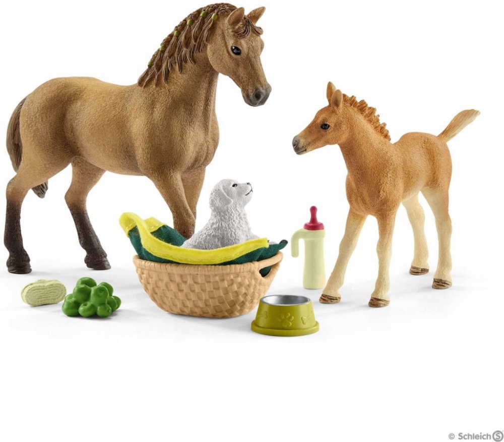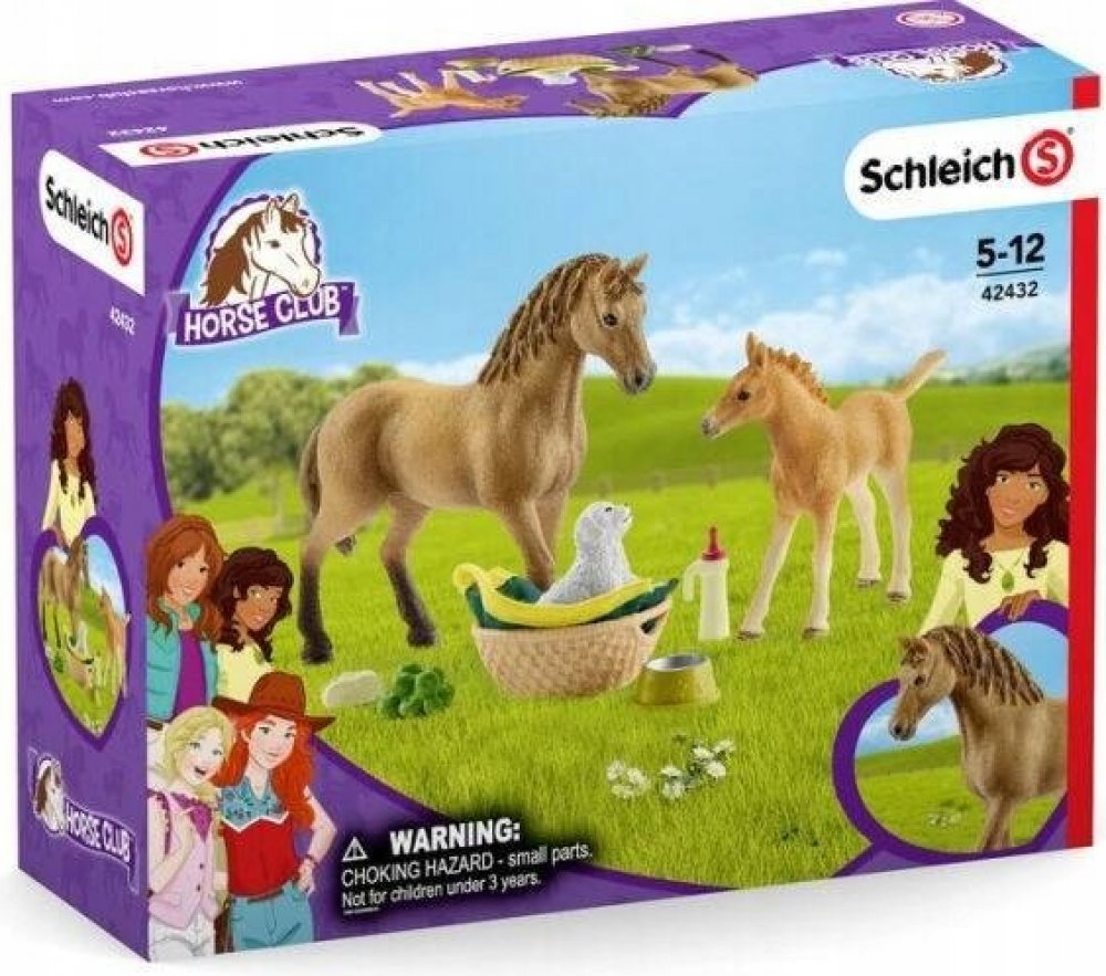 - Balení obsahuje hříbě, Quarter koně, štětně, koš s dekou, lahev, misku, jablka a kartáč.