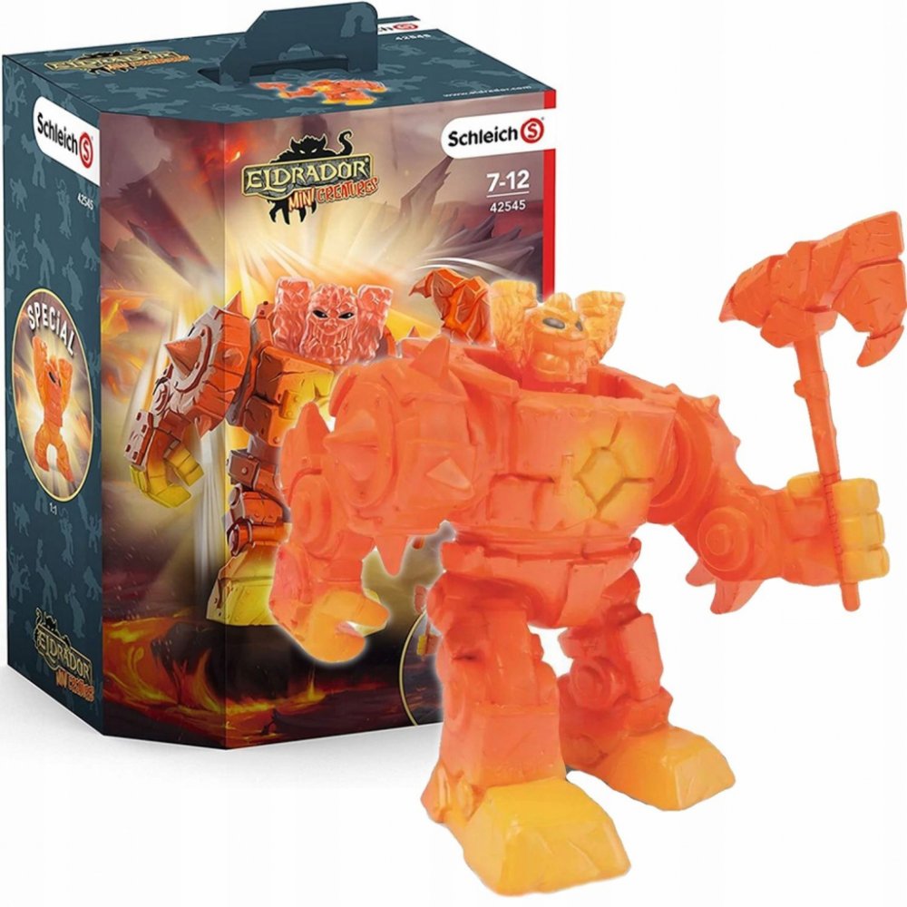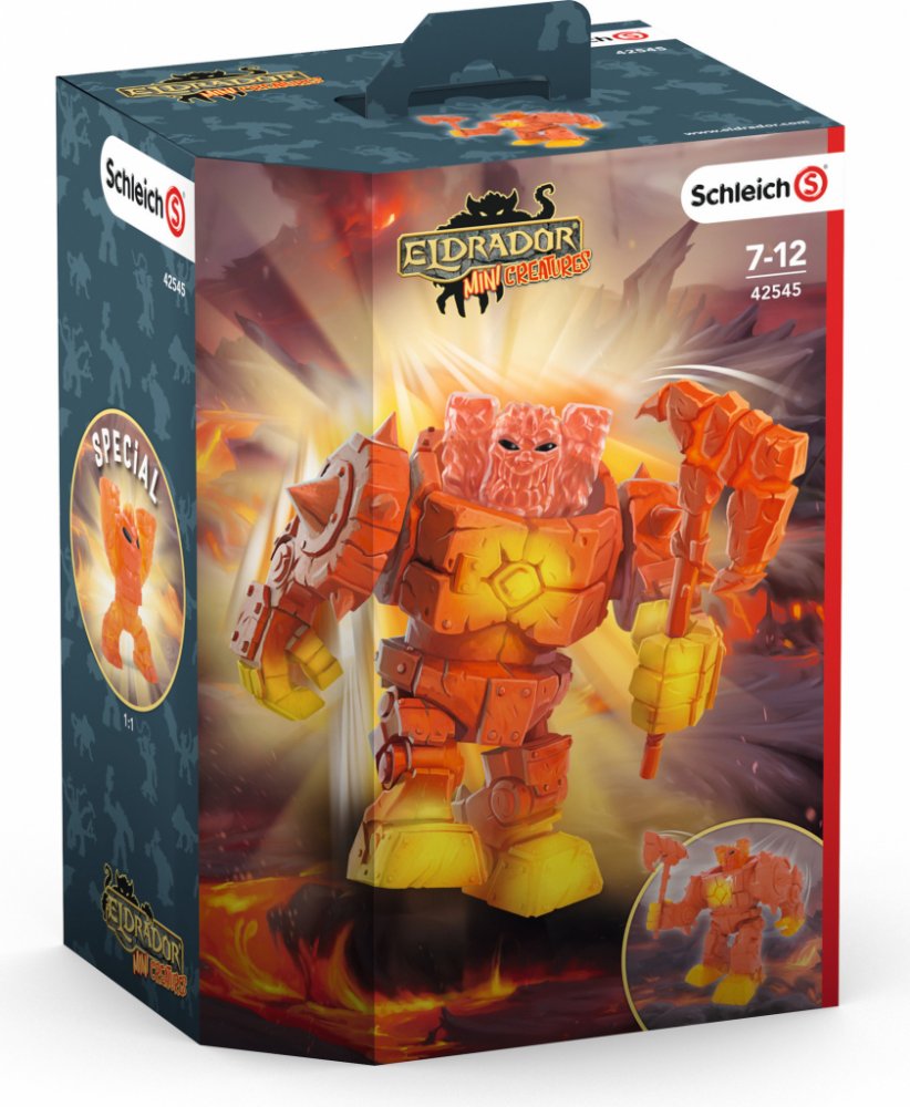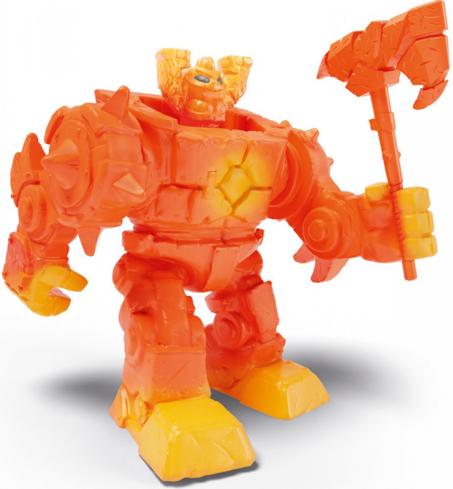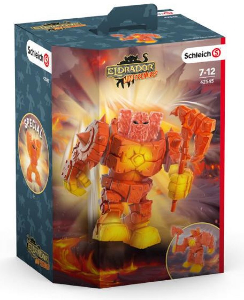 Super silný Eldrador Mini Creatures Lávový Robot od Schleich® Eldrador® byl stvořen Mini tvory ze silného lávového kamene, aby jim mohl pomoci znovu vybudovat zničený Lávový svět. S pomocí svých pohyblivých paží a vyměnitelné, žhnoucí lávové sekery dokáže Lávový Robot rozbít zmrzlé lávové kameny a zkrotit divoké lávové proudy. Ale nyní obr s trny vytváří jen chaos v ostatních Eldradorských světech...