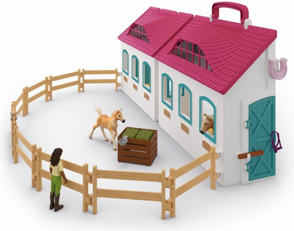 Sada obsahuje detailně propracovanou stáj, kterou lze snadno složit a vzít kamkoliv s sebou. Přídavná přihrádka pod střechou je ideální pro uložení příslušenství, jako jsou balíky sena a svazky mrkve. Plotové prvky ohrady zajišťují, že vše zůstane na svém místě.