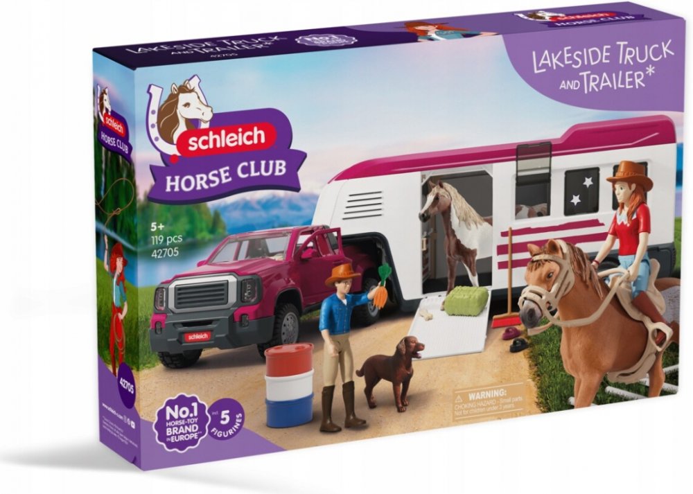 Vydej se na jezdecké dobrodružství Auto Lakeside s přívěsem od Schleich Horse Club je ideální parťák pro každou cestu na závody nebo výlet s koňmi. Velké robustní vozidlo s detailně propracovaným interiérem snadno převeze koně i jejich jezdce a navíc ukrývá spoustu realistického příslušenství pro péči o zvířata i pořádnou dávku zábavy.