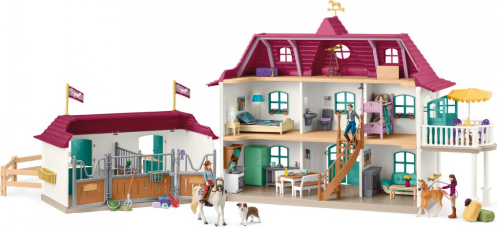 Venkovský dům a stáj u jezera HORSE CLUB má vše, co koně a jejich přátelé mohou potřebovat. Uzda a sedlo na jízdu jsou uloženy ve stáji. Poté na tebe čeká hadice na vodu, kbelík a kartáč na péči o hříbě a arabskou klisnu. Dům rodiny Kramerových je pohodlně zařízen a má dokonce balkón. Dokonce i rodinný pes Ruby se tu cítí jako doma. Figurky jsou plně pohyblivé.