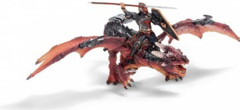 Bojový drak zn. Schleich je na hřbetě obrněný železnými pláty. Jeho křídla jsou zasazena v kloubech a jsou PLNĚ POHYBLIVÁ. Postavu jezdce je možno sejmout a v sedle ji přidržuje magnet Rozpětí plně roztažených křídel činí 43 cm. Od hlavy k ocasu měří bojový drak 26 cm. Jezdec je oblečen ve tmavé zbroji se zlatými a červenými ozdobami. Model bojového draKa byl vzorován v roce 2012. Hračka pro děti ...