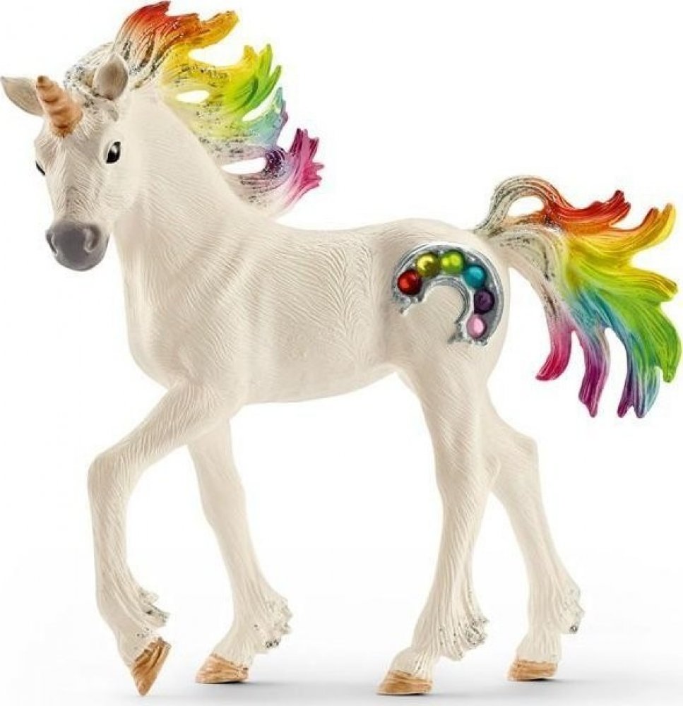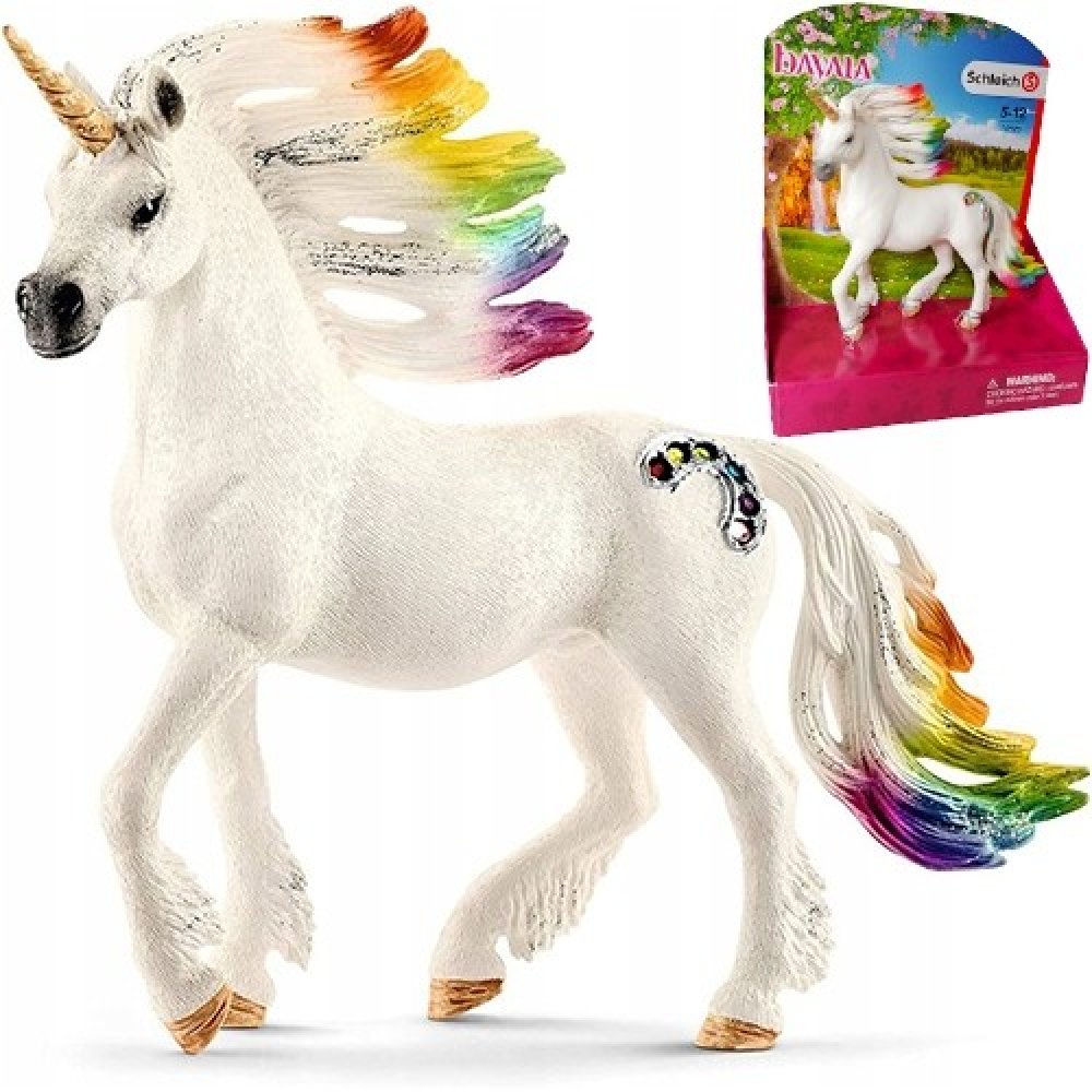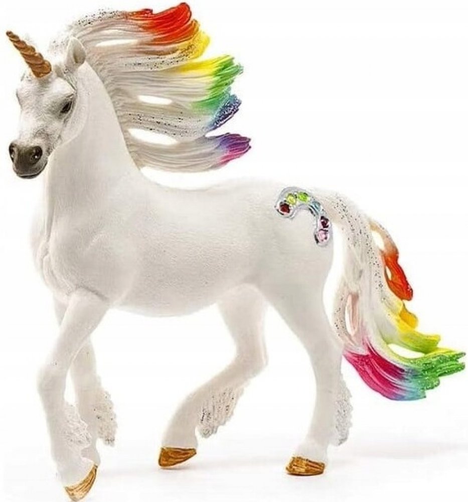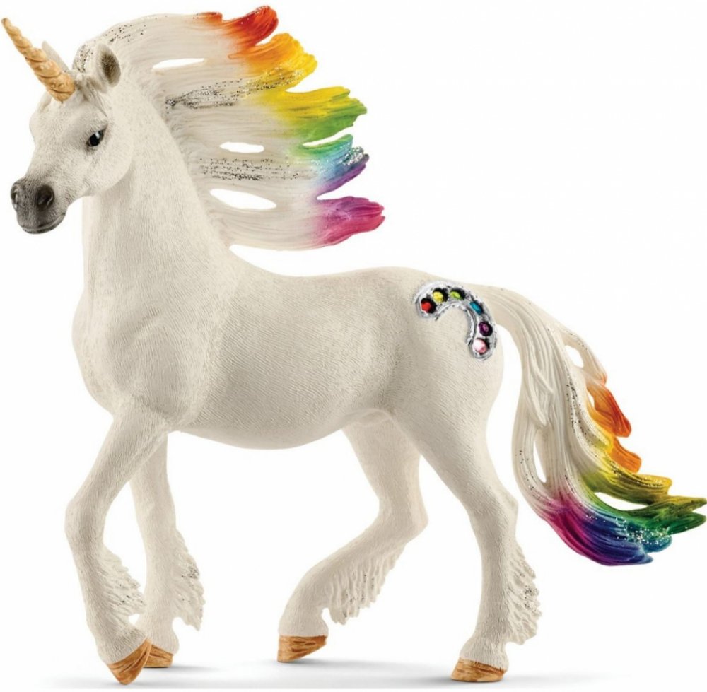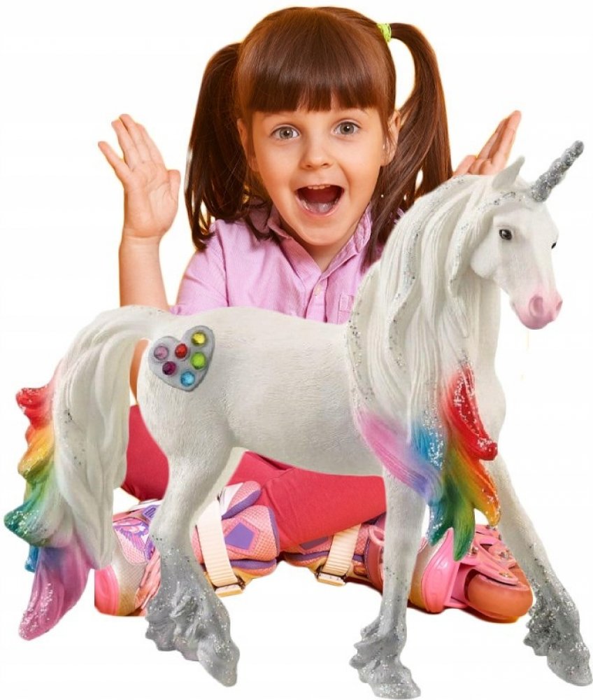 Hříva duhových jednorožců září v paprscích vycházejícího slunce všemi barvami duhy. Jejich boky zdobí barevné drahokamy. O těchto plachých, ušlechtilých zvířatech koluje mnoho pověstí, neboť setkat se s nimi není jednoduché. Říká se, že duhoví jednorožci umí čarovat a léčit. Rodina duhového jednorožce žije na trávou porostlé pláni u duhové řeky. Ve světle ranního slunce hrají hřívy těchto tří kouzelných zvířat všemi barvami duhy. A stejně jako většina jednorožců jsou také tito velmi plaší. Několik málo jedinců, kteří měli to štěstí, že je na vlastní oči zahlédli, vypráví o jejich nádherných barvách a o jejich půvabu. A vypráví o drahých kamenech v duhových barvách, které zdobí křídla těchto magických jednorožců. Tato zvířata jsou opředena tajuplnými příběhy, o kterých nikdo neví, zda jsou pravdivé. Ale všichni si jsou za jedno, že duhoví jednorožci jsou unikátně krásná a magická zvířata. Všechny figurky Schleich jsou propracované do posledního detailu a láskyplně ručně malované. Rozměry: 15 x 8,5 x 18 cm (Š x H x V)