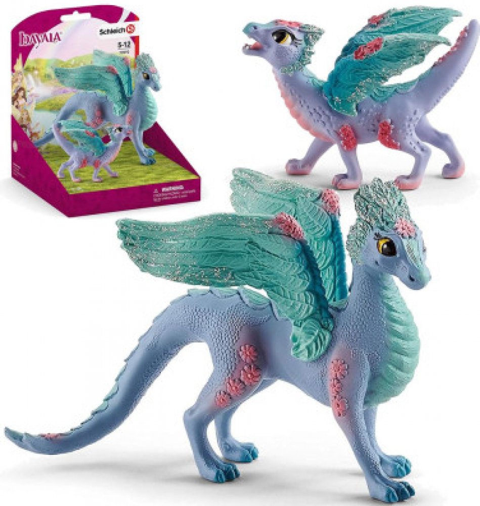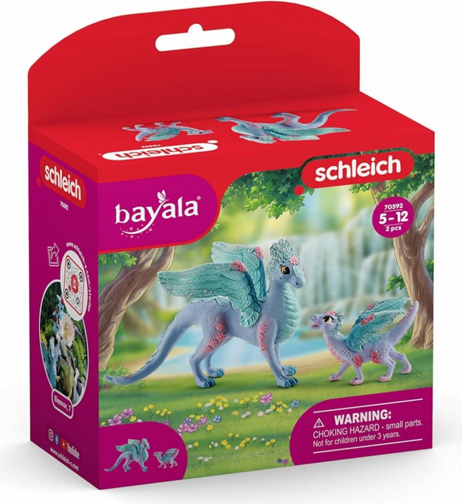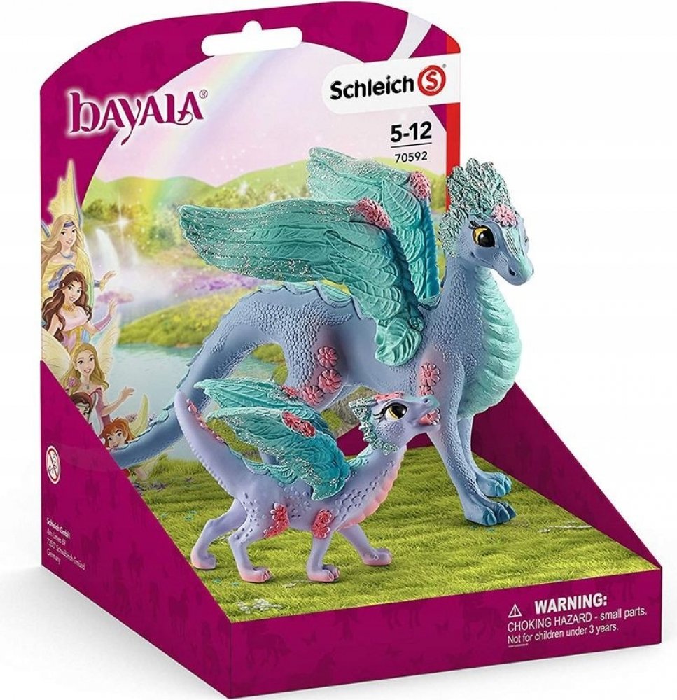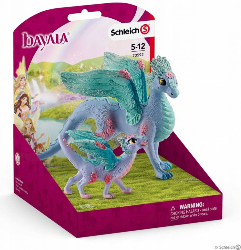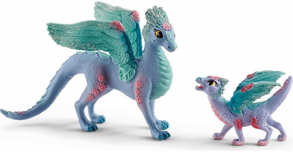 Překrásná dračí matka a její půvabné mládě od Schleich® bayala® žijí v širých květinových polích blýskavého světa bayala. Dračí mládě si tam našlo kamaráda na hraní, konkrétně hříbě květinového jednorožce. Oba se rádi prohánějí pro loukách. Dračí matka a květinový pegas jim s potěšením přihlížejí. V širých květinových polích světa Schleich® bayala® bydlí dračí matka a její líbezné mládě. Malý drak...