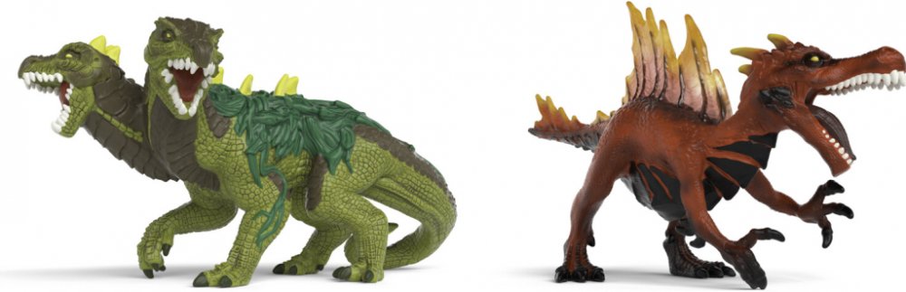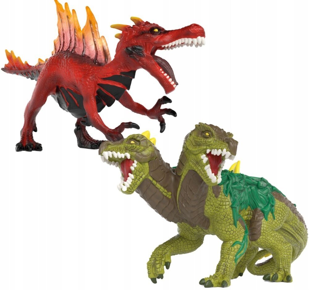 Láva proti džungli! Hurá do boje! Ohnivý dinosaurus a ještěr z džungle svádějí nervy drásající bitvu. Ohnivý dinosaurus otvírá mohutnou tlamu a cení své ostré zuby. Hrůza! Ještěr z džungle má hned dvě hlavy. Chce útočníka rozdrtit dvěma silnými kousnutími. Kdo vyhraje souboj? Raději se držte dál! Figurky se vejdou do BattleCaves.