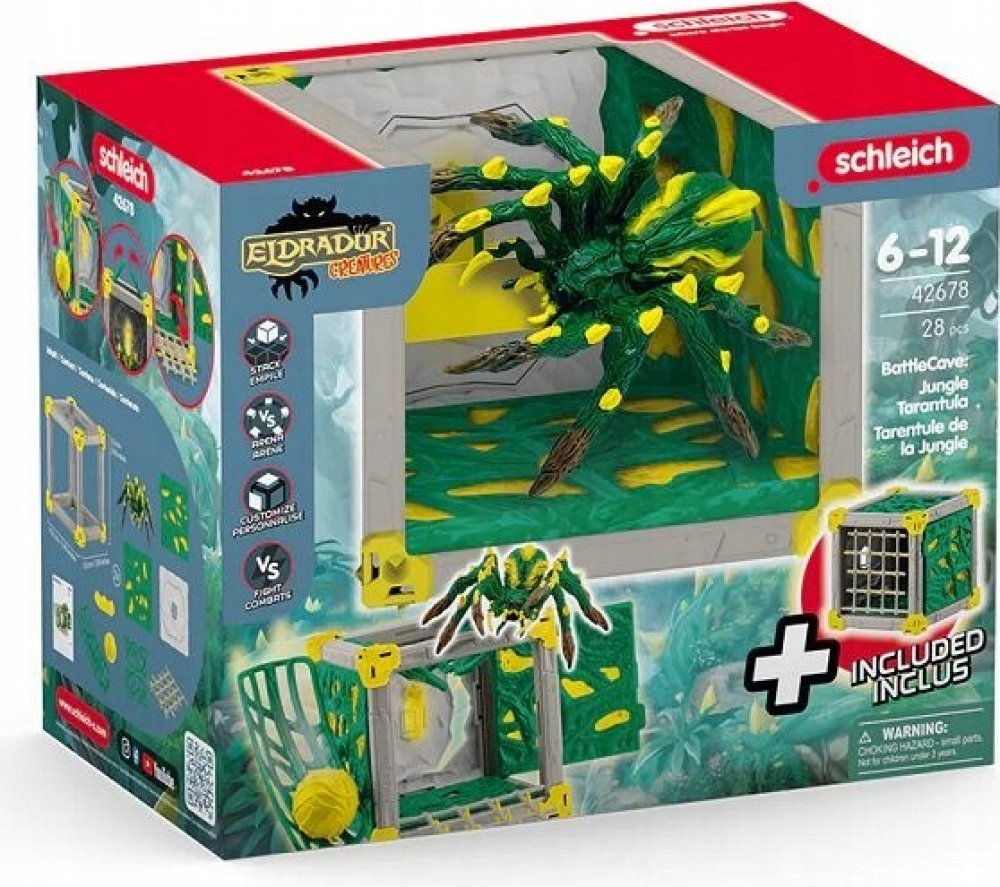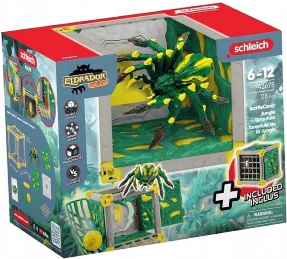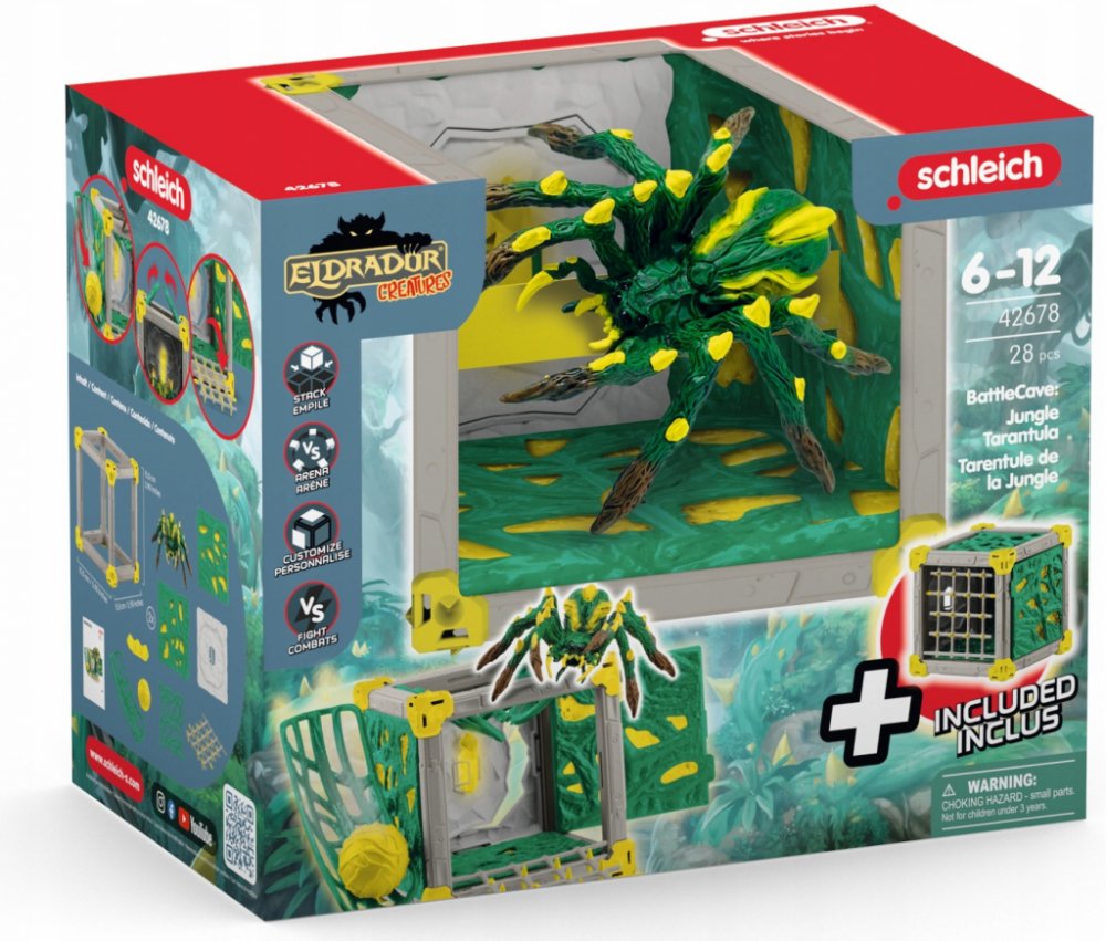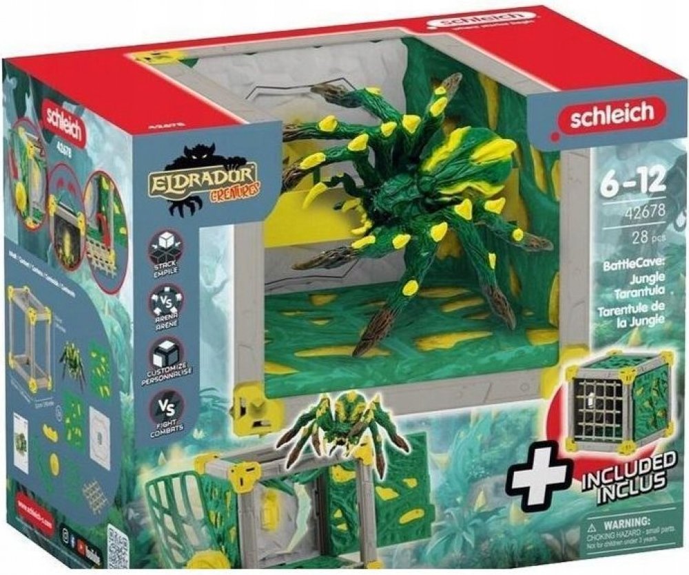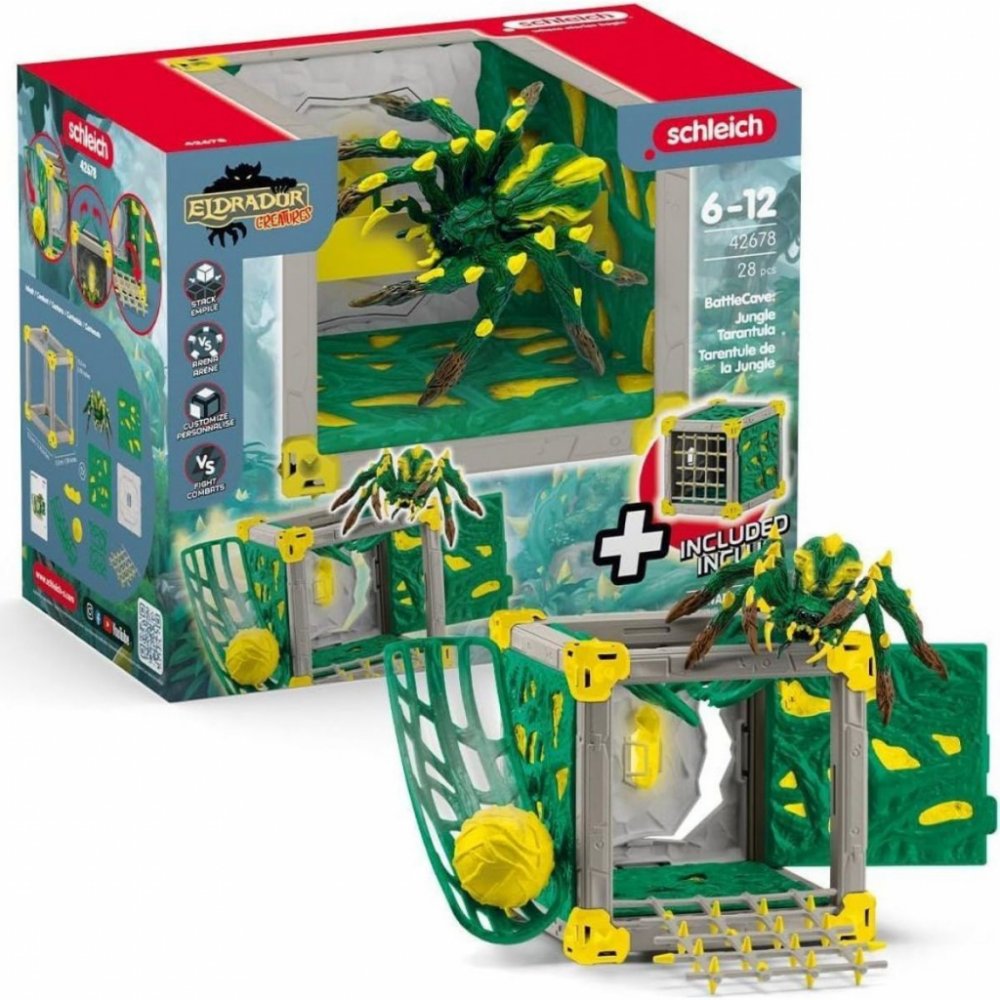 Tarantule z džungle je nebezpečný nepřítel. Všichni se obávají jejího jedového kousnutí. Není divu, že byla vybrána, aby chránila krystal světa ve své aréně BattleCave! Každý den číhá na útočníky a převálcuje je velkou koulí. Spouští ji ze sítě přímo na své nepřátele. A ani se nepokoušej oklamat tarantuli z džungle a vstoupit střechou! Pod liánami jsou skryté padací dveře. Pokud na ně šlápneš, padneš přímo do její jedovaté náruče. Odporné! Arény ELDRADOR® CREATURES BattleCave promění každý dětský pokoj v akční zónu! Kdo bude čelit dechberoucí bitvě? Všechny arény BattleCaves lze kombinovat. Na útočníky čekají děsivé tunely a záludné pasti. Ve velké aréně se pak mohou utkat v závěrečném souboji. To je ale boj!
