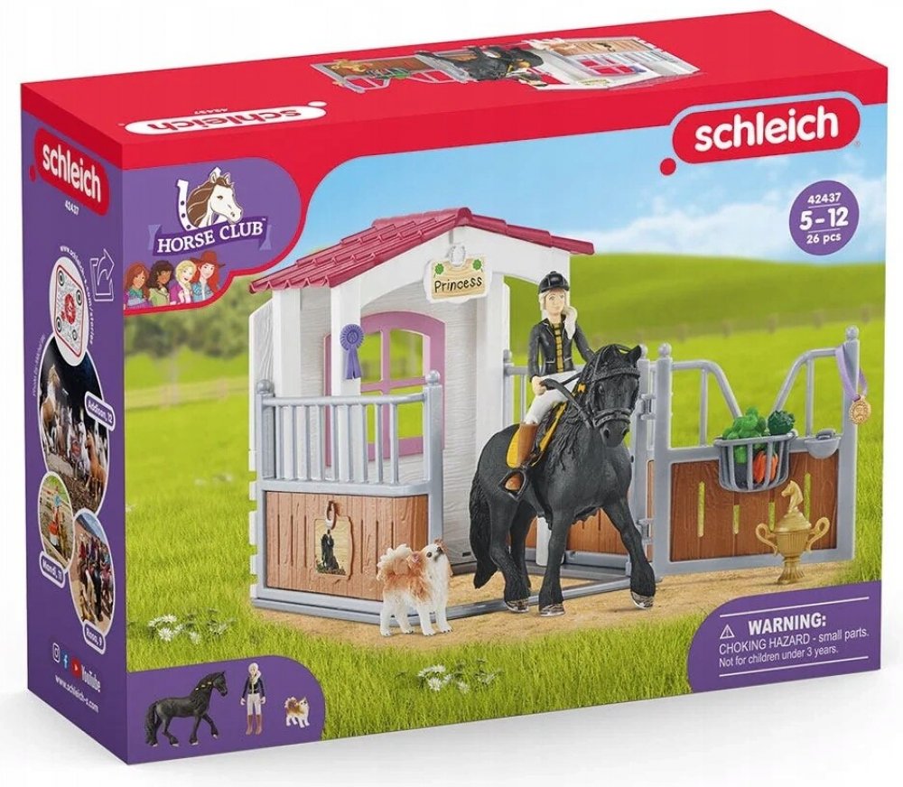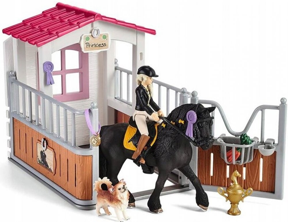 Box pro koně Tori a Princess z jezdeckého klubu série schleich® HORSE CLUB zaujme svým vybavením. Vítězná stuha, zlatá medaile a pohár jsou důkazem společných jezdeckých úspěchů plně pohyblivé figurky Tori a její nádherné fríské klisny Princess. Stěny boxu jsou ozdobeny pěknými nálepkami, na které se dá libovolně psát. Odnímatelná střecha slouží zároveň jako další místo, kam se dá něco postavit. Uzda, otěže a sedlo jsou na dosah ruky a čekají na další trénink – stejně jako mrkev jako odměna. Zatímco kobyla spokojeně stojí u krmítka a napajedla, veselá čivava Tori, Beauty, běhá kolem boxu.