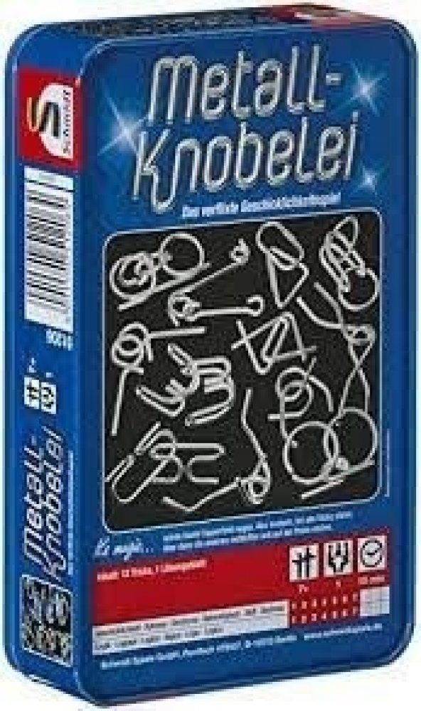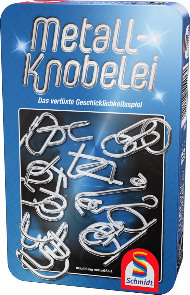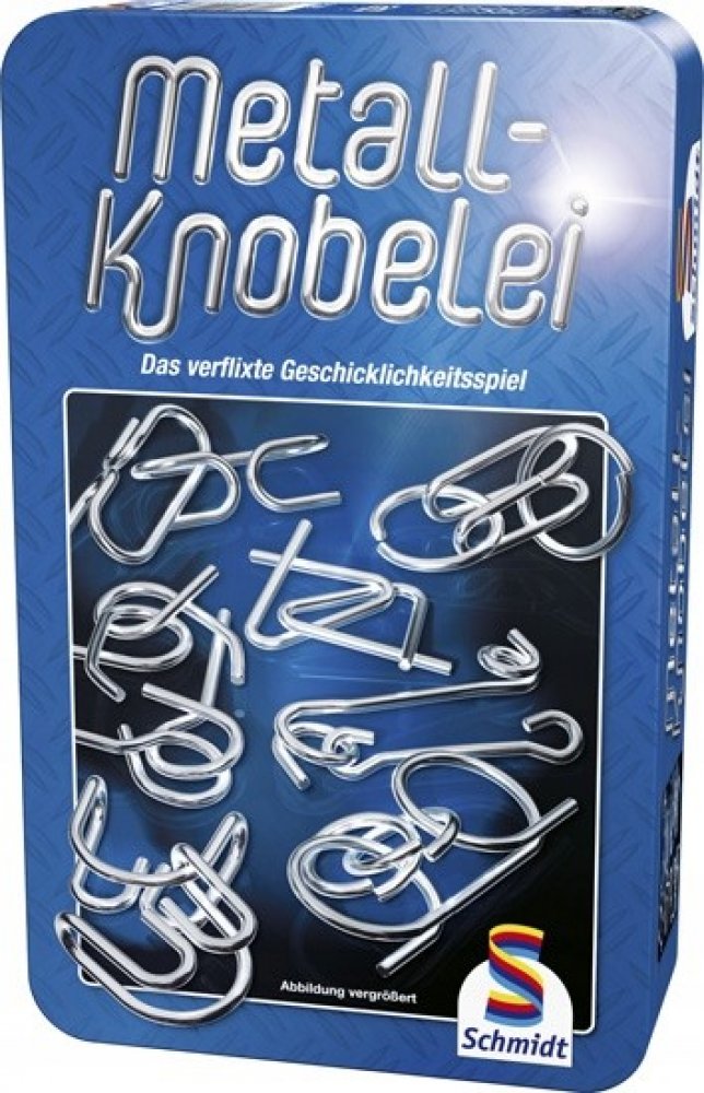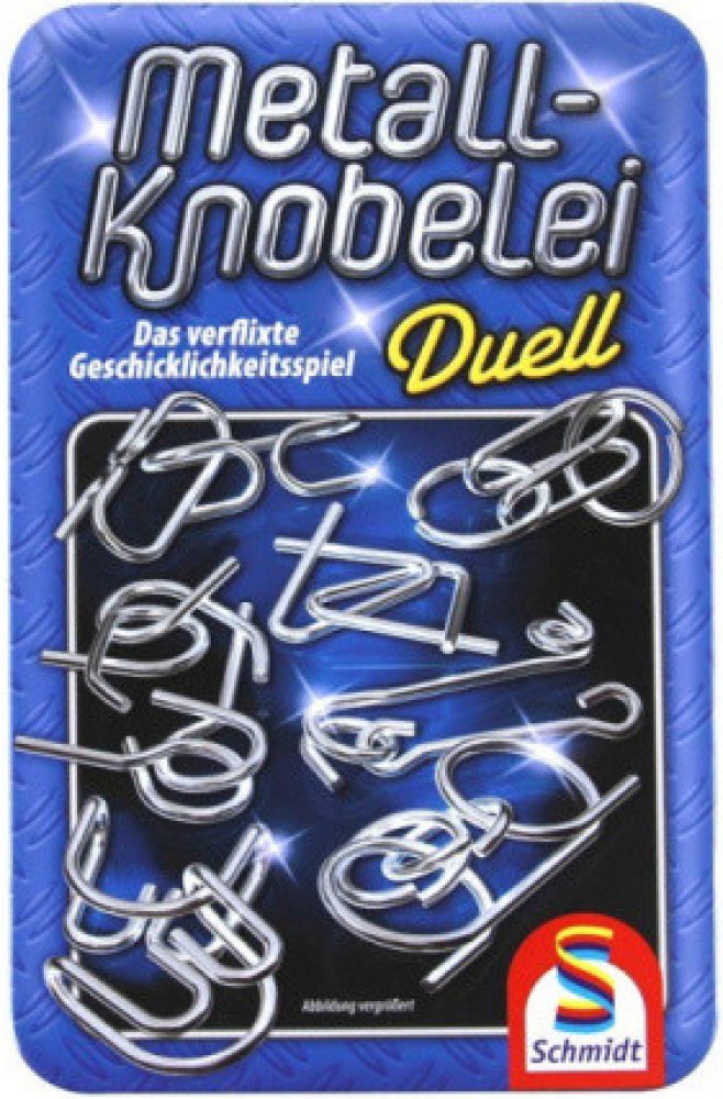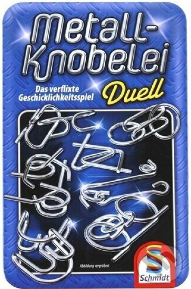 Dvanáct malých kovových hlavolamů SCHMIDT Metall-Knobelei Duell v plechové krabičce. Každý hlavolam je složen ze dvou částí. Úkolem je nejprve najít způsob, jak tyto dvě části bez použití síly od sebe úplně oddělit a následně je zase spojit k sobě do výchozí pozice.