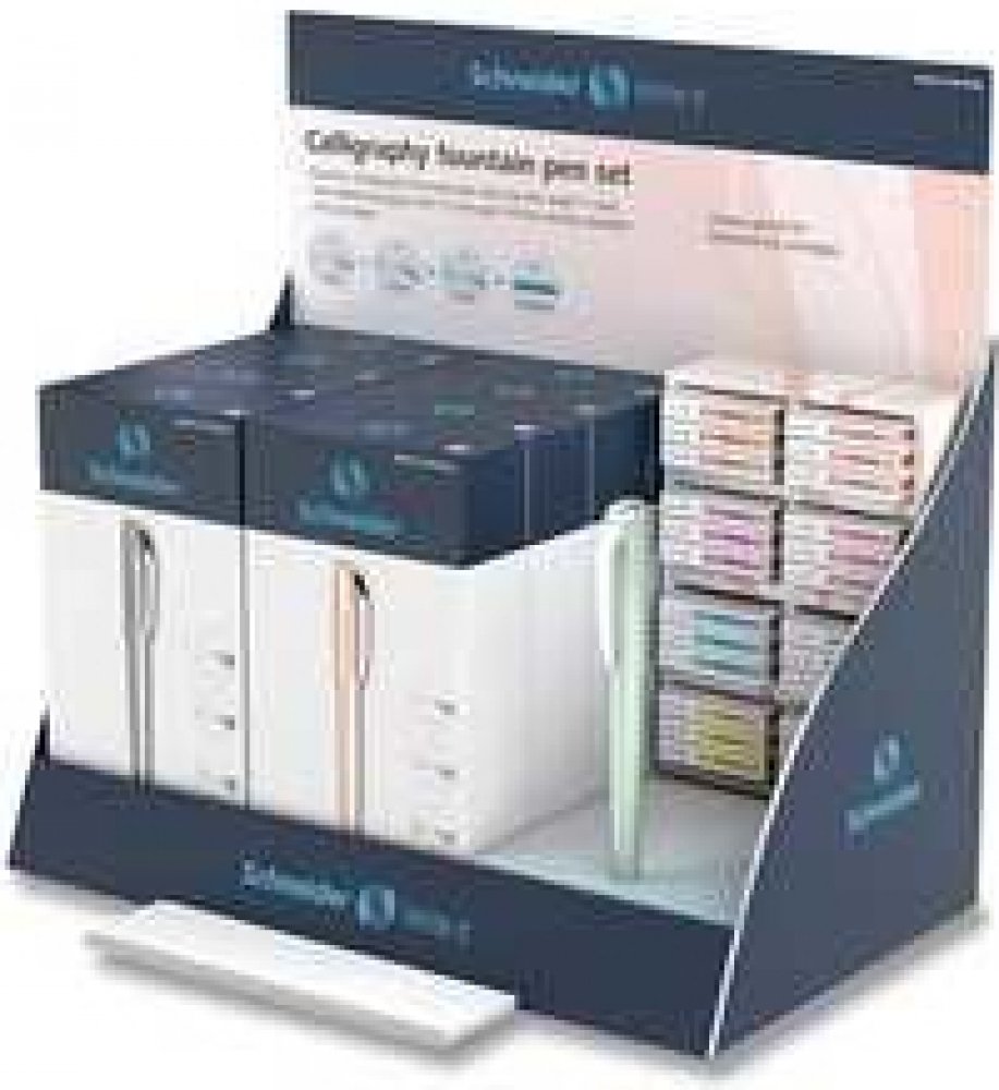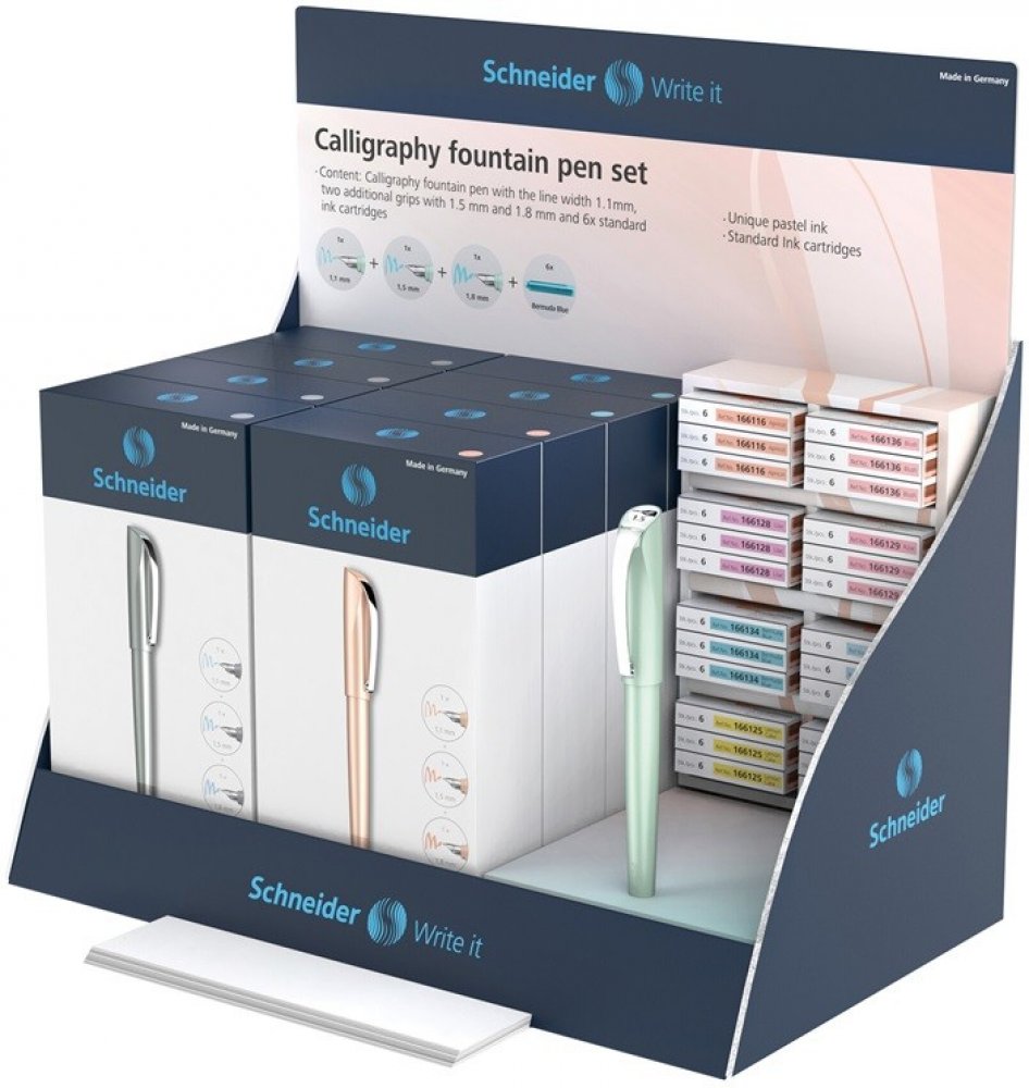 Pultový stojánek se 32 kusy z řady kaligrafických per Schneider Callissima – ideální pro prezentaci v prodejnách nebo na kreativních dílnách.