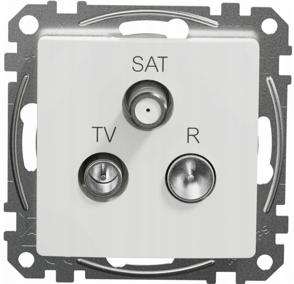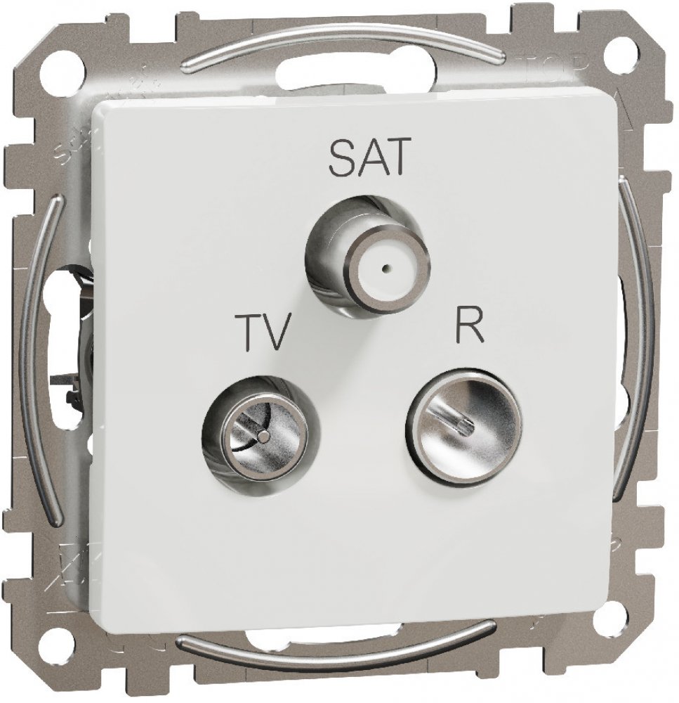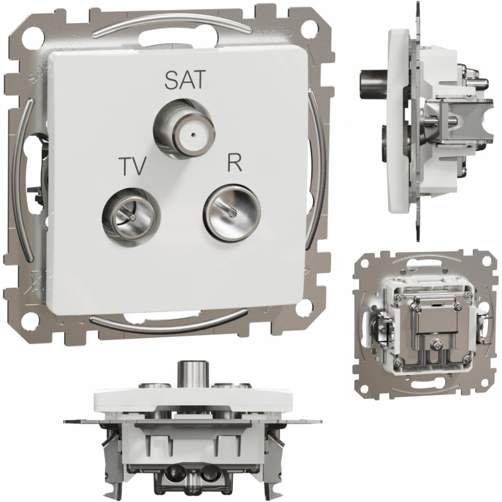 Zásuvka TV-R-SAT koncová Schneider Electric SEDNA bílá SDD111481 je třívstupová. Používá se pro rozvod televizního signálu, rádiového signálu a satelitního signálu, který odbočí na jednom místě a propustí jej na druhém místě. v bytovkách. Koncová znamená, že je koncová zásuvka pro přijímač. Zásuvka se dodává bez rámečku, který si v případě nakombinování s jinými vypínači, zásuvkami nebo vícenásobn...