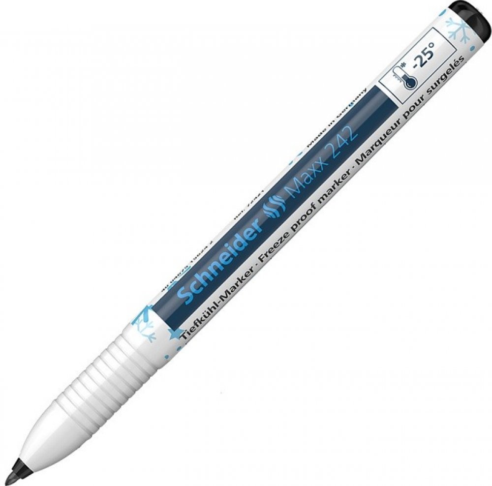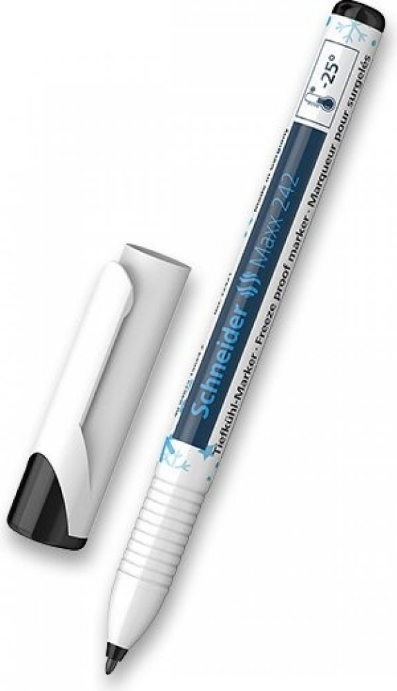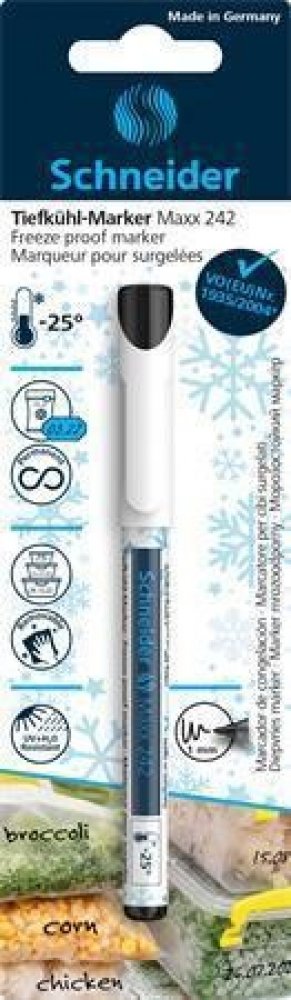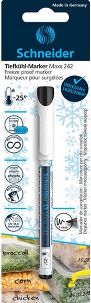 Popisovač Schneider Maxx 242 je určen permanentní pro popisování na mrazicí sáčky a fólie, které ukládáte do mrazáku. Zároveň slouží jako smývatelný popisovač na hladké nádoby a sklo do mrazáku. Jeho inkoust je černý a mrazuvzdorný do -25 °C, odolný proti oděru, vodě a světlu.