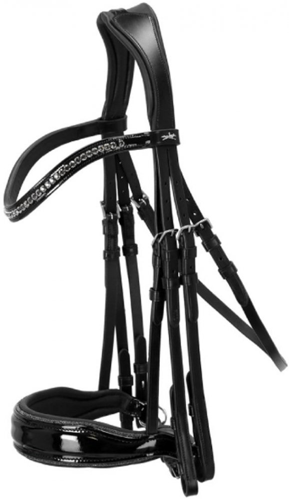 Drezurní uzda z ekologické kůže od firmy Schockemöhle Sports neponechává nic náhodě pokud jde o vzhled a funkčnost. Dokonale přiléhá k hlavě koně. Lakovaný nánosník zdobený třpytivým lemováním a čelenka posázená krystaly. Měkký anatomicky tvarovaný nátylník v širším provedení, který rozkládá tlak. S touto elegantní uzdou vždy zazáříte. Barva: černá. Velikost: Full.