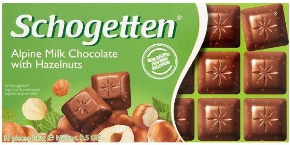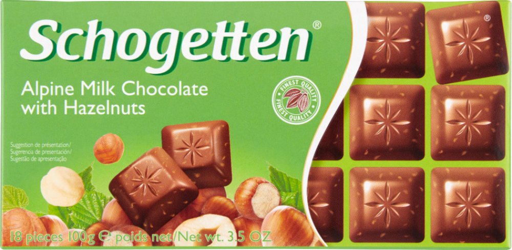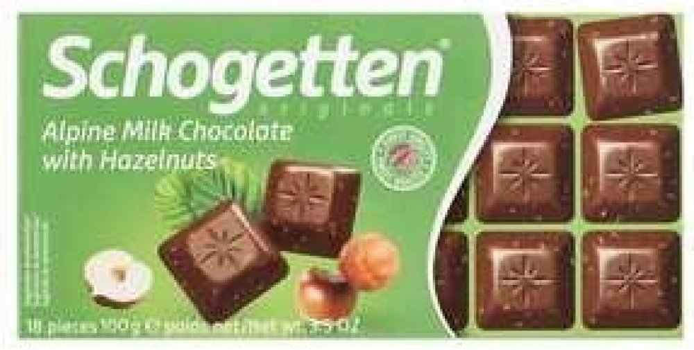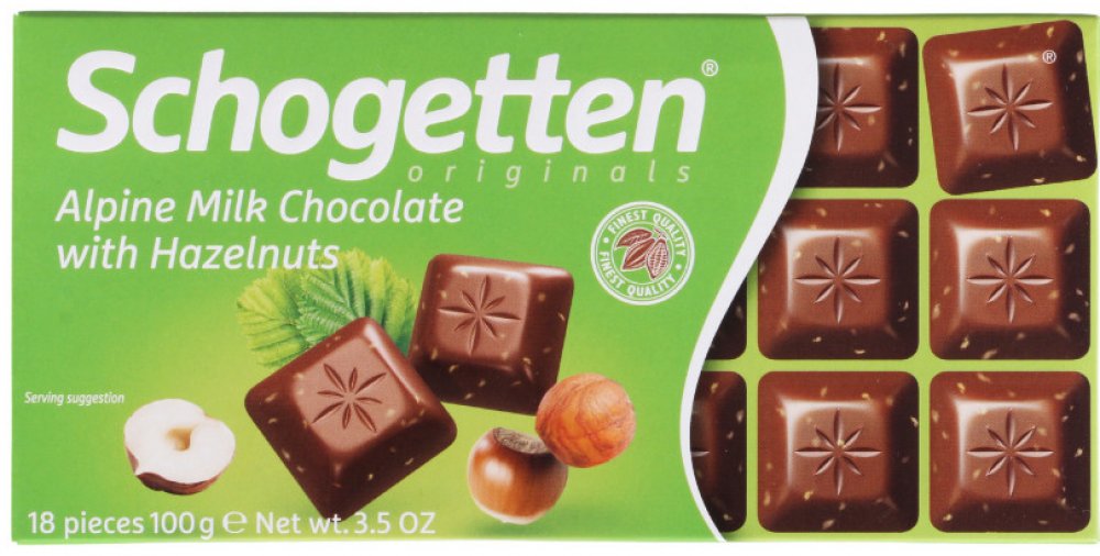 Alpská mléčná čokoláda s kousky lískových oříšků.